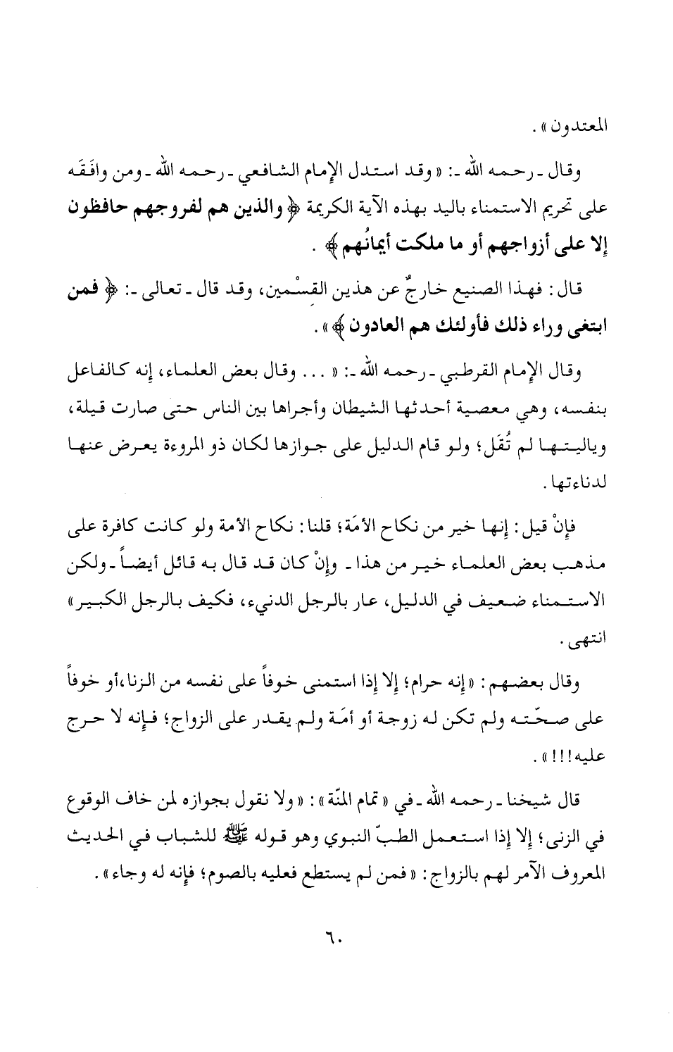 وقال -رحمه الله-: "وقد استدل الإِمام الشافعي -رحمه الله- ومن وافَقَه على تحريم الاستمناء باليد بهذه الآية الكريمة {والذين هم لفروجهم حافظون * إِلا على أزواجهم أو ما ملكت أيمانُهم}.