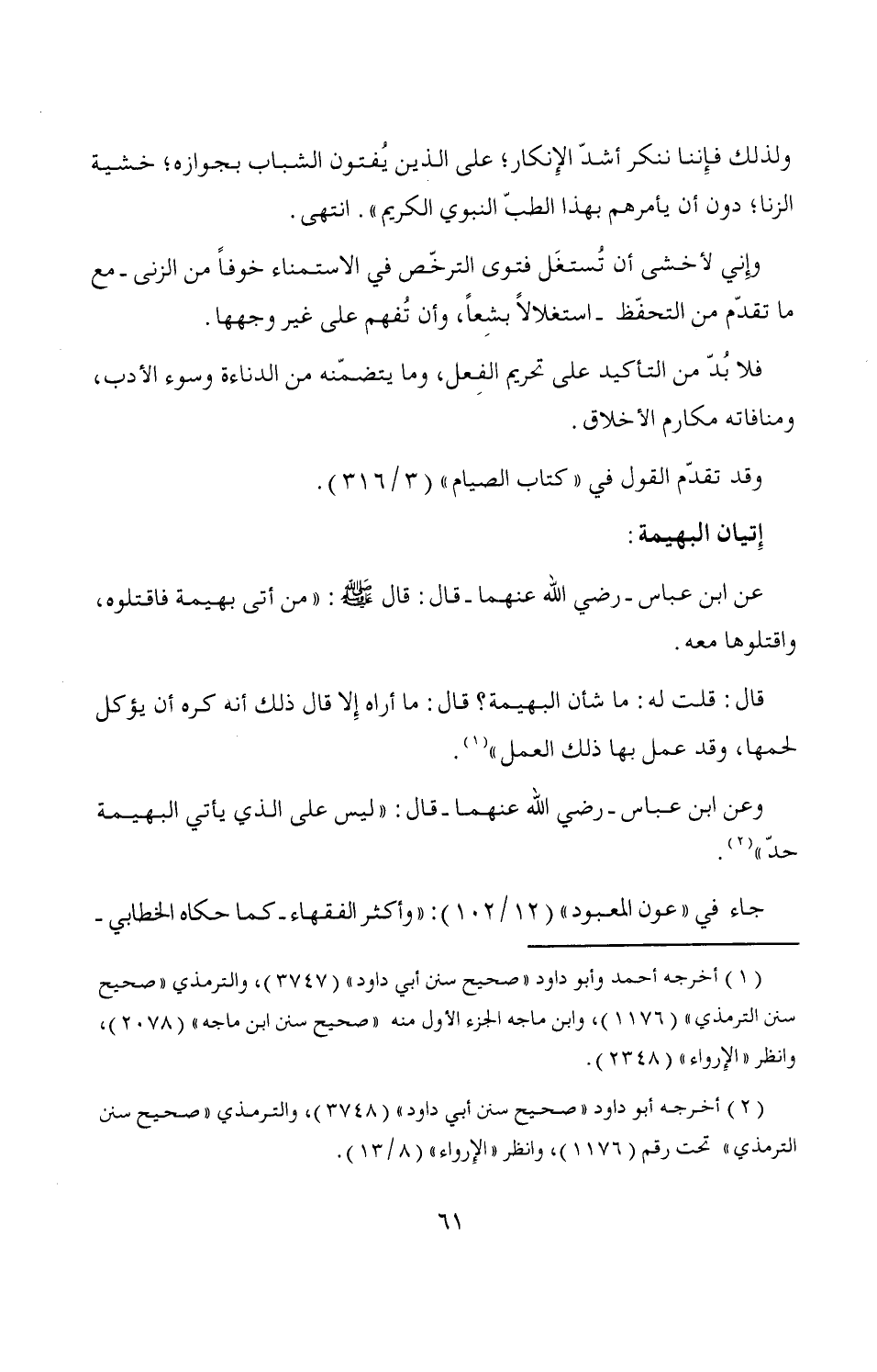 ولذلك فإِننا ننكر أشدّ الإِنكار، على الذين يُفتون الشباب بجوازه، خشية الزنا؛ دون أن يأمرهم بهذا الطبّ النبوي الكريم". انتهى.