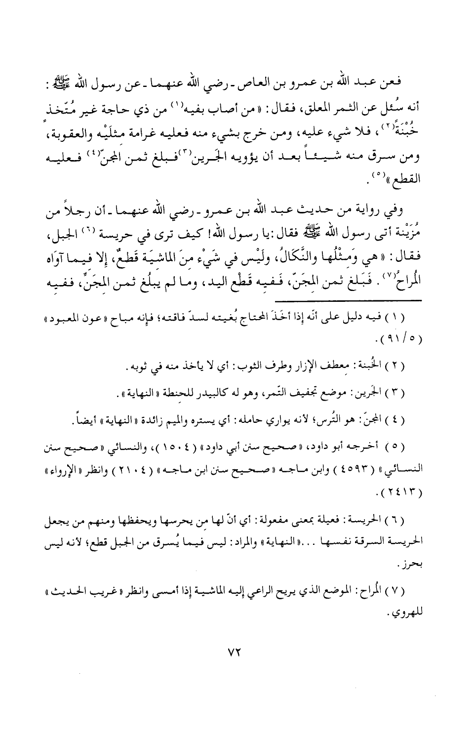 (¬6) الحريسة: فعيلة بمعنى مفعولة: أي أنّ لها مِن يحرسها ويحفظها ومنهم من يجعل الحريسة السرقة نفسها ... "النهاية" والمراد: ليس فيما يُسرق من الجبل قطع، لأنه ليس بحرز.