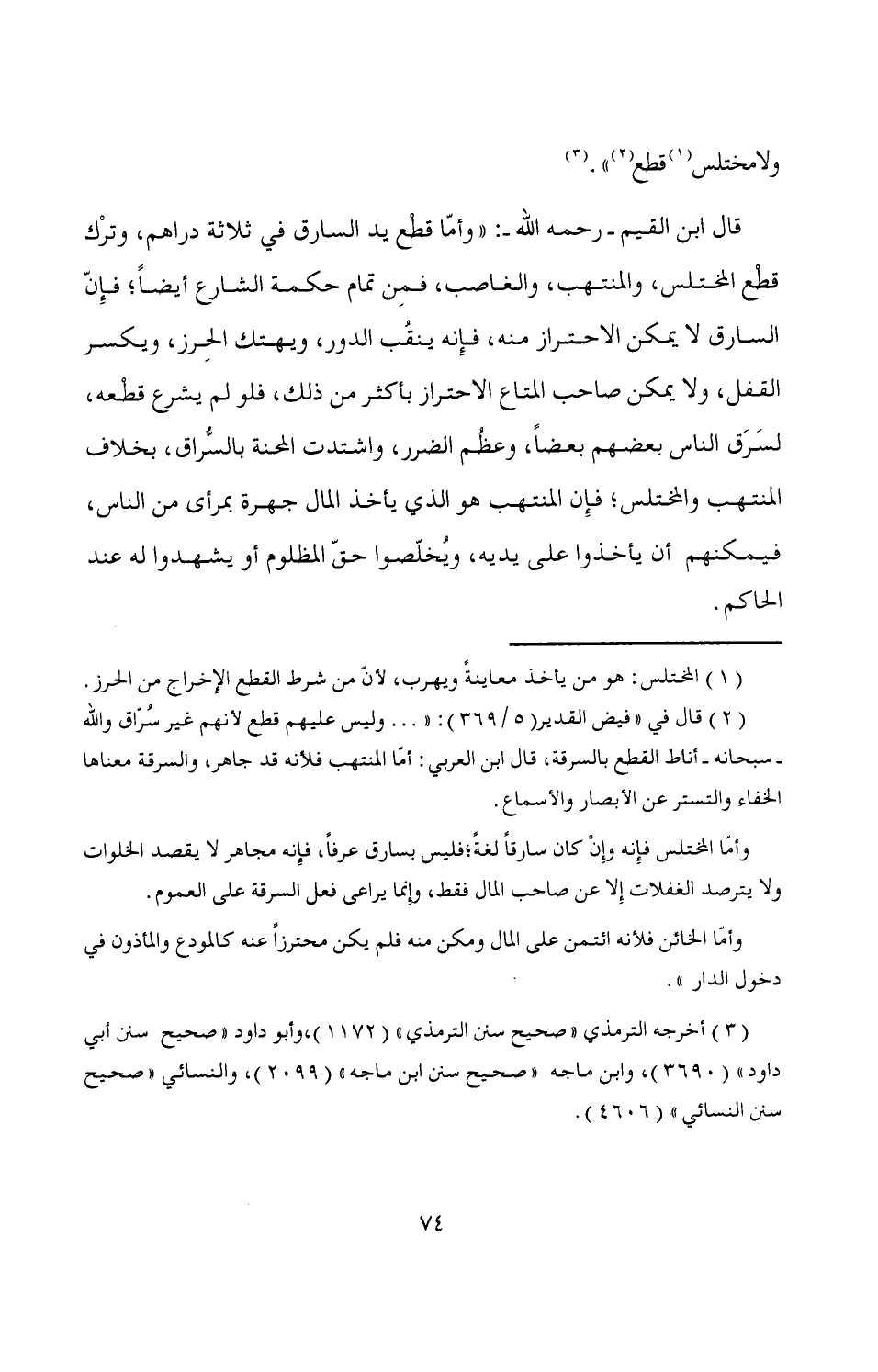 (¬2) قال في "فيض القدير" (5/ 369): " ... وليس عليهم قطع لأنهم غير سُرّاق والله -سبحانه- أناط القطع بالسرقة، قال ابن العربي: أمّا المنتهب فلأنه قد جاهر، والسرقة معناها الخفاء والتستر عن الأبصار والأسماع.