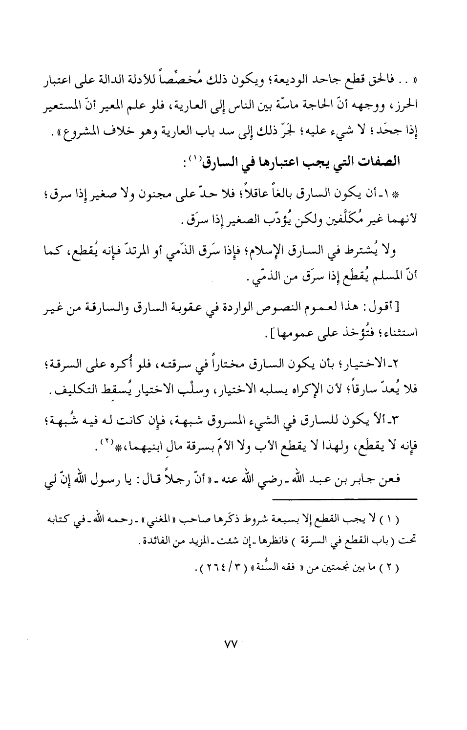 (¬1) لا يجب القطع إِلا بسبعة شروط ذكرها صاحب "المغني" -رحمه الله- في كتابه تحت (باب القطع في السرقة) فانظرها -إِن شئت- المزيد من الفائدة.