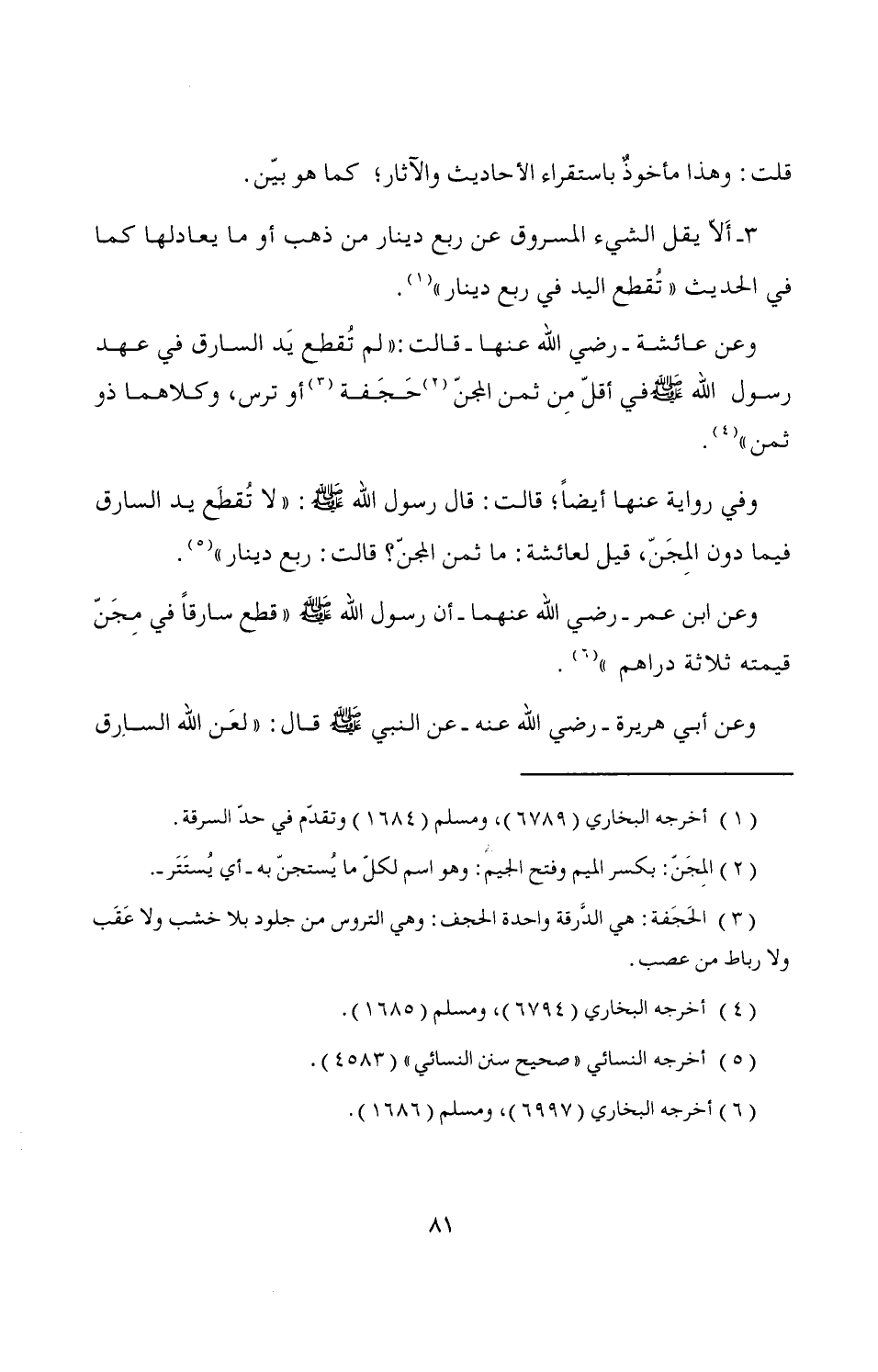 وعن ابن عمر -رضي الله عنهما- أن رسول الله - صَلَّى اللَّهُ عَلَيْهِ وَسَلَّمَ - "قطع سارقاً في مِجَنّ قيمته ثلاثة دراهم" (¬6).