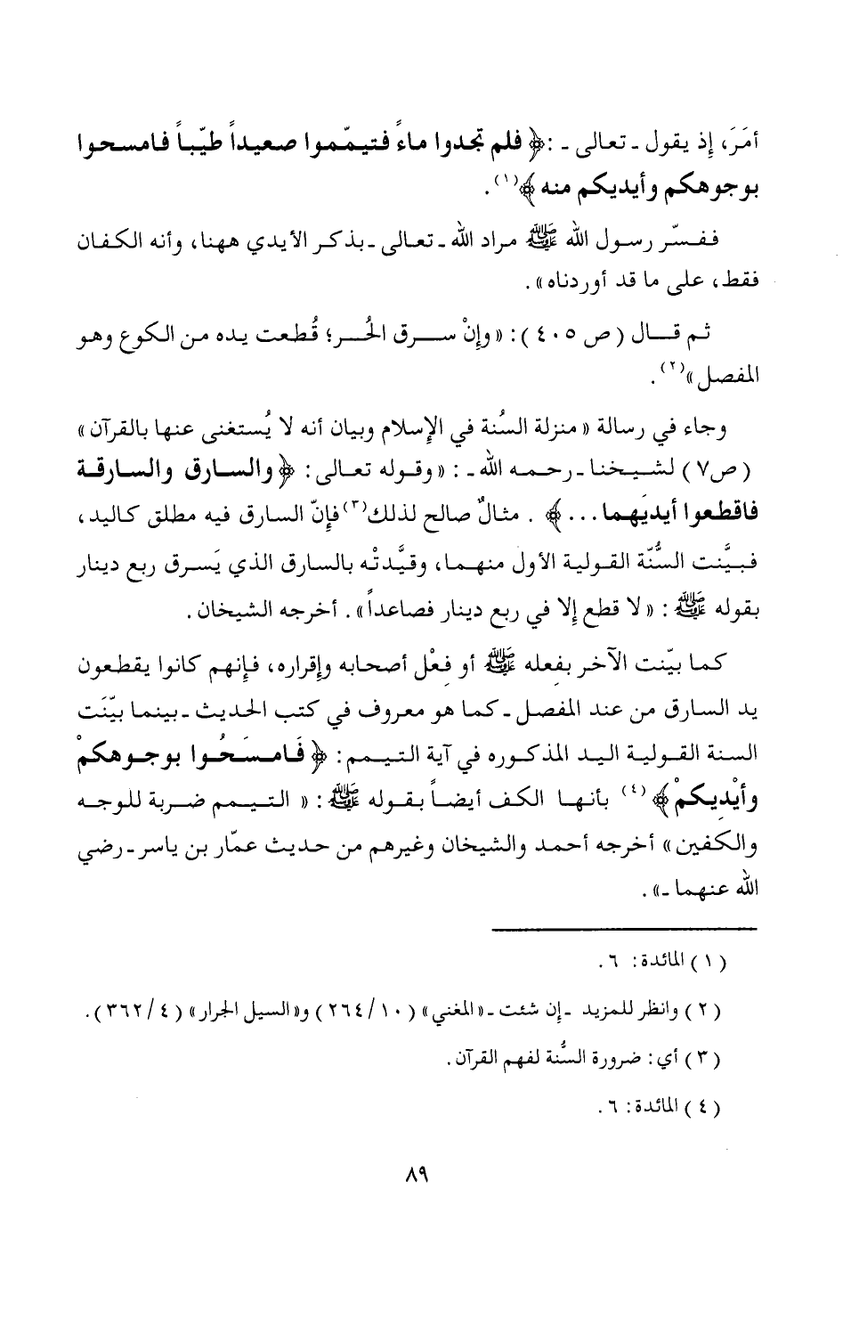 كما بيّنت الآخر بفِعله - صَلَّى اللَّهُ عَلَيْهِ وَسَلَّمَ - أو فِعْل أصحابه وإِقراره، فإِنهم كانوا يقطعون يد السارق من عند المفصل -كما هو معروف في كتب الحديث- بينما بيّنَت السنة القولية اليد المذكوره في آية التيمم: {فَامسَحُوا بوجوهكمْ وأيْدِيكمْ} (¬4) بأنها الكف أيضاً بقوله - صَلَّى اللَّهُ عَلَيْهِ وَسَلَّمَ -: "التيمم ضربة للوجه والكفين" أخرجه أحمد والشيخان وغيرهم من حديث عمّار بن ياسر -رضي الله عنهما-".