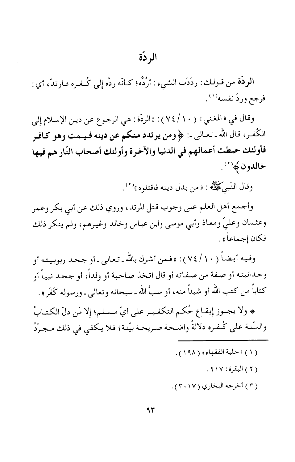 وقال في "المغني" (10/ 74): "الردّة: هي الرجوع عن دين الإِسلام إِلى الكُفر، قال الله -تعالى-: {ومن يرتدد منكم عن دينه فيمت وهو كافر فأولئك حبطت أعمالهم في الدنيا والآخرة وأولئك أصحاب النّار هم فيها خالدون} (¬2).