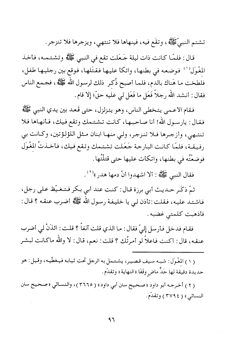 فقام الأعمى يتخطى الناس، وهو يتزلزل، حتى قَعد بين يدي النبي - صَلَّى اللَّهُ عَلَيْهِ وَسَلَّمَ - فقال: يا رسول الله! أنا صاحبها، كانت تشتمك وتقع فيك، فأنهاها فلا تنتهي، وأزجرها فلا تنزجر، ولي منها ابنان مثل اللؤلؤتين، وكانت بي رفيقة، فلمّا كانت البارحة جَعَلت تشتمك وتقع فيك، فأخذتُ المِغْوَل فوضعْتُه في بطنها، واتكأت عليها حتى قتلْتُها.