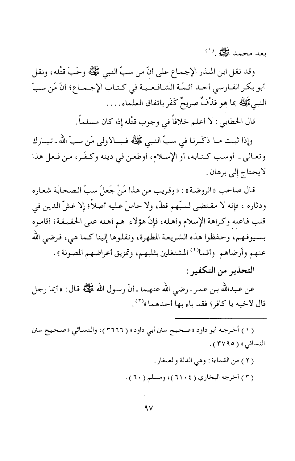 وقد نقل ابن المنذر الإِجماع على أن من سبّ النبي - صَلَّى اللَّهُ عَلَيْهِ وَسَلَّمَ - وجَبَ قتْله، ونقل أبو بكر الفارسي أحد أئمّة الشافعية في كتاب الإِجماع؛ أنّ مَن سبّ النبي - صَلَّى اللَّهُ عَلَيْهِ وَسَلَّمَ - بما هو قذْفٌ صريحٌ كَفَر باتفاق العلماء ....