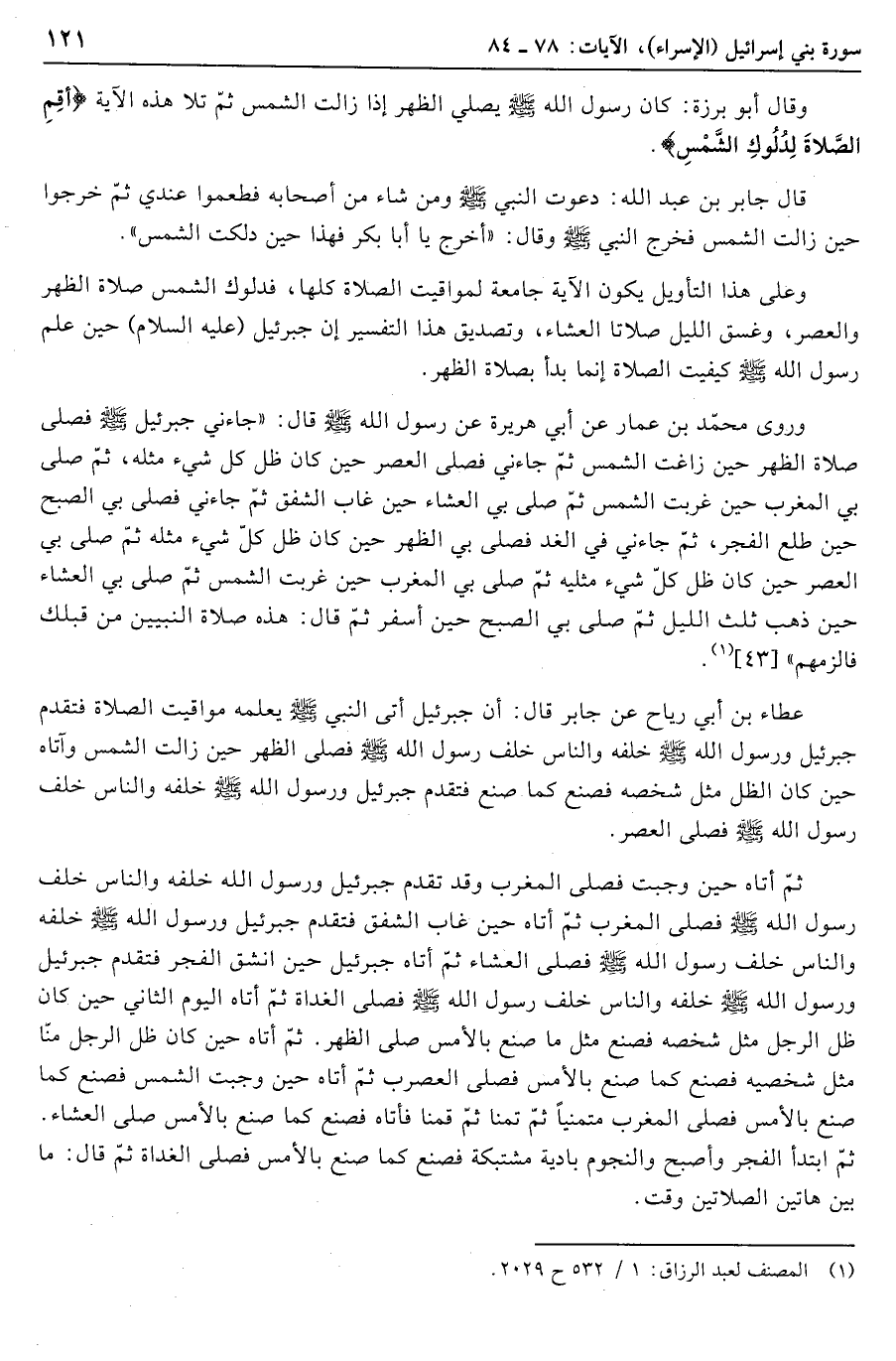 عطاء بن أبي رياح عن جابر قال: أن جبرئيل أتى النبي صلّى الله عليه وسلّم يعلمه مواقيت الصلاة فتقدم جبرئيل ورسول الله صلّى الله عليه وسلّم خلفه والناس خلف رسول الله صلّى الله عليه وسلّم فصلى الظهر حين زالت الشمس وآتاه حين كان الظل مثل شخصه فصنع كما صنع فتقدم جبرئيل ورسول الله صلّى الله عليه وسلّم خلفه والناس خلف رسول الله صلّى الله عليه وسلّم فصلى العصر.
