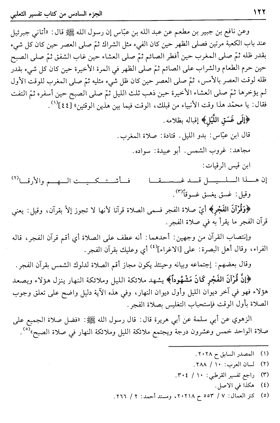 إِنَّ قُرْآنَ الْفَجْرِ كانَ مَشْهُوداً يشهد ملائكة الليل وملائكة النهار ينزل هؤلاء ويصعد هؤلاء فهو في آخر ديوان الليل وأول ديوان النهار، وفي هذه الآية دليل واضح على تعلق وجوب الصلاة بأول الوقت فاستحباب التغليس بصلاة الفجر.