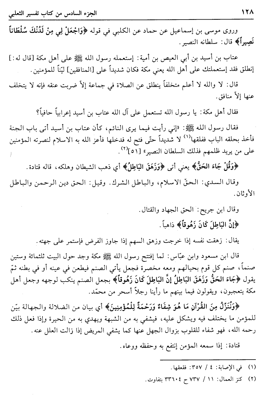 قال ابن مسعود وابن عبّاس: لما افتتح رسول الله صلّى الله عليه وسلّم مكة وجد حول البيت ثلاثمائة وستين صنما، صنم كل قوم بحيالهم ومعه مخصرة فجعل يأتي الصنم فيطعن في عينه أو في بطنه ثمّ يقول جاءَ الْحَقُّ وَزَهَقَ الْباطِلُ إِنَّ الْباطِلَ كانَ زَهُوقاً بجعل الصنم ينكب لوجهه وجعل أهل مكة يتعجبون، ويقولون فيما بينهم ما رأينا رجلا أسحر من محمّد.