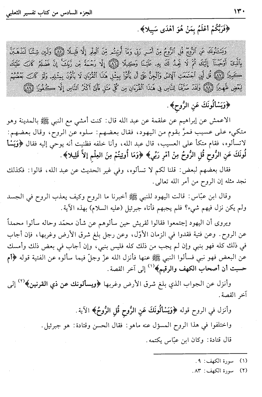 وَيَسْئَلُونَكَ عَنِ الرُّوحِ قُلِ الرُّوحُ مِنْ أَمْرِ رَبِّي وَما أُوتِيتُمْ مِنَ الْعِلْمِ إِلاَّ قَلِيلاً (85) وَلَئِنْ شِئْنا لَنَذْهَبَنَّ بِالَّذِي أَوْحَيْنا إِلَيْكَ ثُمَّ لا تَجِدُ لَكَ بِهِ عَلَيْنا وَكِيلاً (86) إِلاَّ رَحْمَةً مِنْ رَبِّكَ إِنَّ فَضْلَهُ كانَ عَلَيْكَ كَبِيراً (87) قُلْ لَئِنِ اجْتَمَعَتِ الْإِنْسُ وَالْجِنُّ عَلى أَنْ يَأْتُوا بِمِثْلِ هذَا الْقُرْآنِ لا يَأْتُونَ بِمِثْلِهِ وَلَوْ كانَ بَعْضُهُمْ لِبَعْضٍ ظَهِيراً (88) وَلَقَدْ صَرَّفْنا لِلنَّاسِ فِي هذَا الْقُرْآنِ مِنْ كُلِّ مَثَلٍ فَأَبى أَكْثَرُ النَّاسِ إِلاَّ كُفُوراً (89)