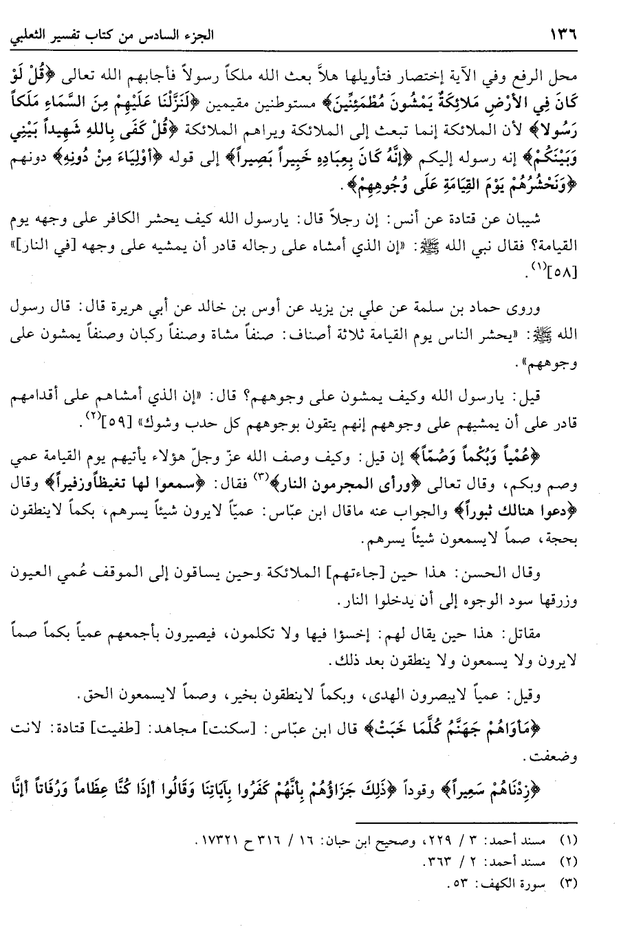 قيل: يا رسول الله وكيف يمشون على وجوههم؟ قال: «إن الذي أمشاهم على أقدامهم قادر على أن يمشيهم على وجوههم إنهم يتقون بوجوههم كل حدب وشوك» [59] «2» .
