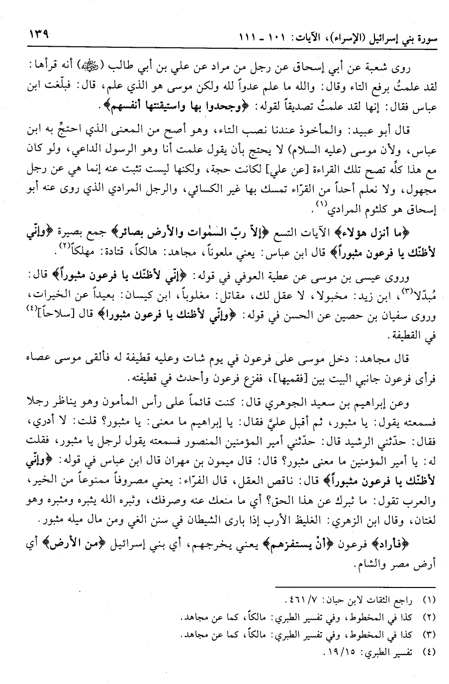 وعن إبراهيم بن سعيد الجوهري قال: كنت قائما على رأس المأمون وهو يناظر رجلا فسمعته يقول: يا مثبور، ثم أقبل عليّ فقال: يا إبراهيم ما معنى: يا مثبور؟ قلت: لا أدري، فقال: حدّثني الرشيد قال: حدّثني أمير المؤمنين المنصور فسمعته يقول لرجل يا مثبور، فقلت له: يا أمير المؤمنين ما معنى مثبور؟ قال: قال ميمون بن مهران قال ابن عباس في قوله: وَإِنِّي لَأَظُنُّكَ يا فِرْعَوْنُ مَثْبُوراً قال: ناقص العقل، قال الفرّاء: يعني مصروفا ممنوعا من الخير، والعرب تقول: ما ثبرك عن هذا الحق؟ أي ما منعك عنه وصرفك، وثبره الله يثبره ومثبره وهو لغتان، وقال ابن الزهري: الغليظ الأرب إذا بارى الشيطان في سنن الغي ومن مال ميله مثبور.