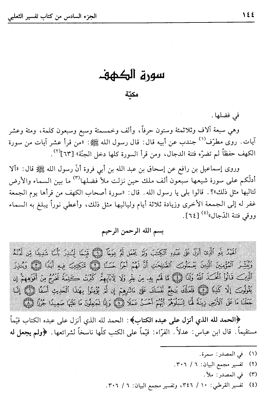 الْحَمْدُ لِلَّهِ الَّذِي أَنْزَلَ عَلى عَبْدِهِ الْكِتابَ وَلَمْ يَجْعَلْ لَهُ عِوَجاً (1) قَيِّماً لِيُنْذِرَ بَأْساً شَدِيداً مِنْ لَدُنْهُ وَيُبَشِّرَ الْمُؤْمِنِينَ الَّذِينَ يَعْمَلُونَ الصَّالِحاتِ أَنَّ لَهُمْ أَجْراً حَسَناً (2) ماكِثِينَ فِيهِ أَبَداً (3) وَيُنْذِرَ الَّذِينَ قالُوا اتَّخَذَ اللَّهُ وَلَداً (4)