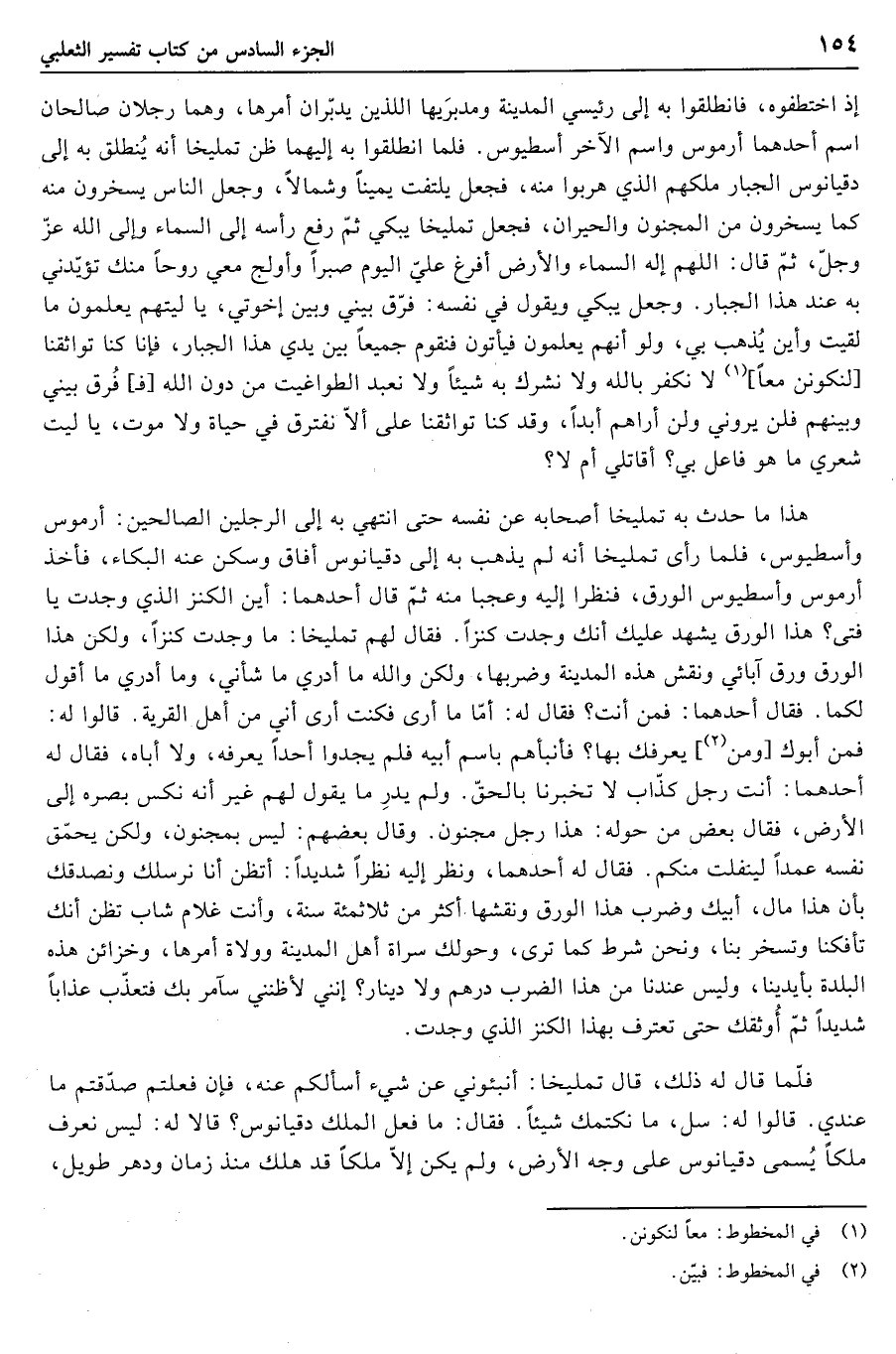 فلمّا قال له ذلك، قال تمليخا: أنبئوني عن شيء أسألكم عنه، فإن فعلتم صدّقتم ما عندي. قالوا له: سل، ما نكتمك شيئا. فقال: ما فعل الملك دقيانوس؟ قالا له: ليس نعرف ملكا يسمى دقيانوس على وجه الأرض، ولم يكن إلّا ملكا قد هلك منذ زمان ودهر طويل،