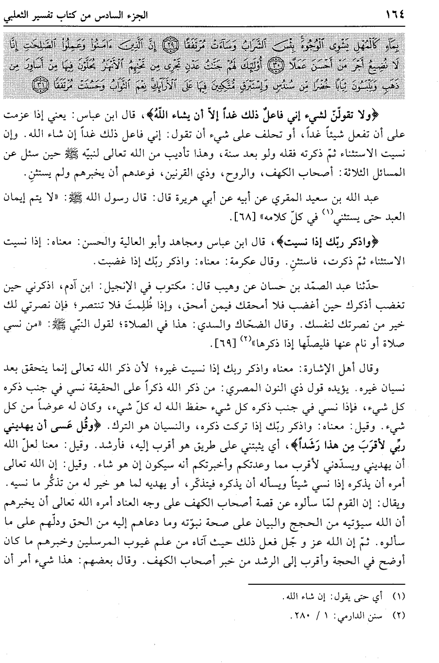 وَلا تَقُولَنَّ لِشَيْءٍ إِنِّي فاعِلٌ ذلِكَ غَداً إِلَّا أَنْ يَشاءَ اللَّهُ، قال ابن عباس: يعني إذا عزمت على أن تفعل شيئا غدا، أو تحلف على شيء أن تقول: إني فاعل ذلك غدا إن شاء الله. وإن نسيت الاستثناء ثمّ ذكرته فقله ولو بعد سنة، وهذا تأديب من الله تعالى لنبيّه صلّى الله عليه وسلّم حين سئل عن المسائل الثلاثة: أصحاب الكهف، والروح، وذي القرنين، فوعدهم أن يخبرهم ولم يستثن.