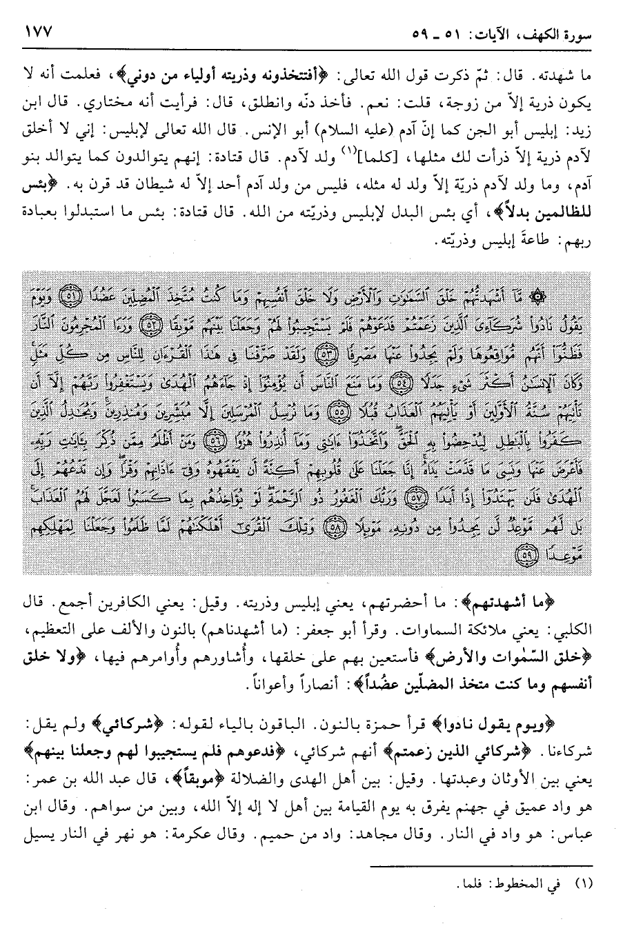 ما أَشْهَدْتُهُمْ خَلْقَ السَّماواتِ وَالْأَرْضِ وَلا خَلْقَ أَنْفُسِهِمْ وَما كُنْتُ مُتَّخِذَ الْمُضِلِّينَ عَضُداً (51) وَيَوْمَ يَقُولُ نادُوا شُرَكائِيَ الَّذِينَ زَعَمْتُمْ فَدَعَوْهُمْ فَلَمْ يَسْتَجِيبُوا لَهُمْ وَجَعَلْنا بَيْنَهُمْ مَوْبِقاً (52) وَرَأَى الْمُجْرِمُونَ النَّارَ فَظَنُّوا أَنَّهُمْ مُواقِعُوها وَلَمْ يَجِدُوا عَنْها مَصْرِفاً (53) وَلَقَدْ صَرَّفْنا فِي هذَا الْقُرْآنِ لِلنَّاسِ مِنْ كُلِّ مَثَلٍ وَكانَ الْإِنْسانُ أَكْثَرَ شَيْءٍ جَدَلاً (54) وَما مَنَعَ النَّاسَ أَنْ يُؤْمِنُوا إِذْ جاءَهُمُ الْهُدى وَيَسْتَغْفِرُوا رَبَّهُمْ إِلاَّ أَنْ تَأْتِيَهُمْ سُنَّةُ الْأَوَّلِينَ أَوْ يَأْتِيَهُمُ الْعَذابُ قُبُلاً (55)