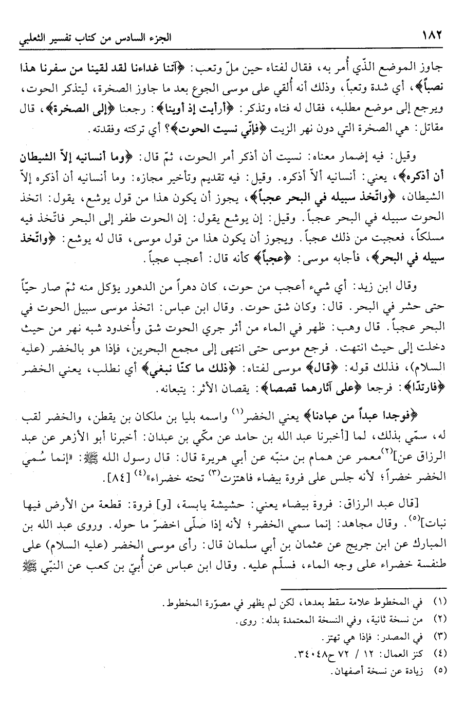 وقال ابن زيد: أي شيء أعجب من حوت، كان دهرا من الدهور يؤكل منه ثمّ صار حيّا حتى حشر في البحر. قال: وكان شق حوت. وقال ابن عباس: اتَّخَذَ موسى سبيل الحوت فِي الْبَحْرِ عَجَباً. قال وهب: ظهر في الماء من أثر جري الحوت شق وأخدود شبه نهر من حيث دخلت إلى حيث انتهت. فرجع موسى حتى انتهى إلى مجمع البحرين، فإذا هو بالخضر (عليه السلام) ، فذلك قوله: قالَ موسى لفتاه: ذلِكَ ما كُنَّا نَبْغِ أي نطلب، يعني الخضر فَارْتَدَّا: فرجعا عَلى آثارِهِما قَصَصاً: يقصان الأثر: يتبعانه.