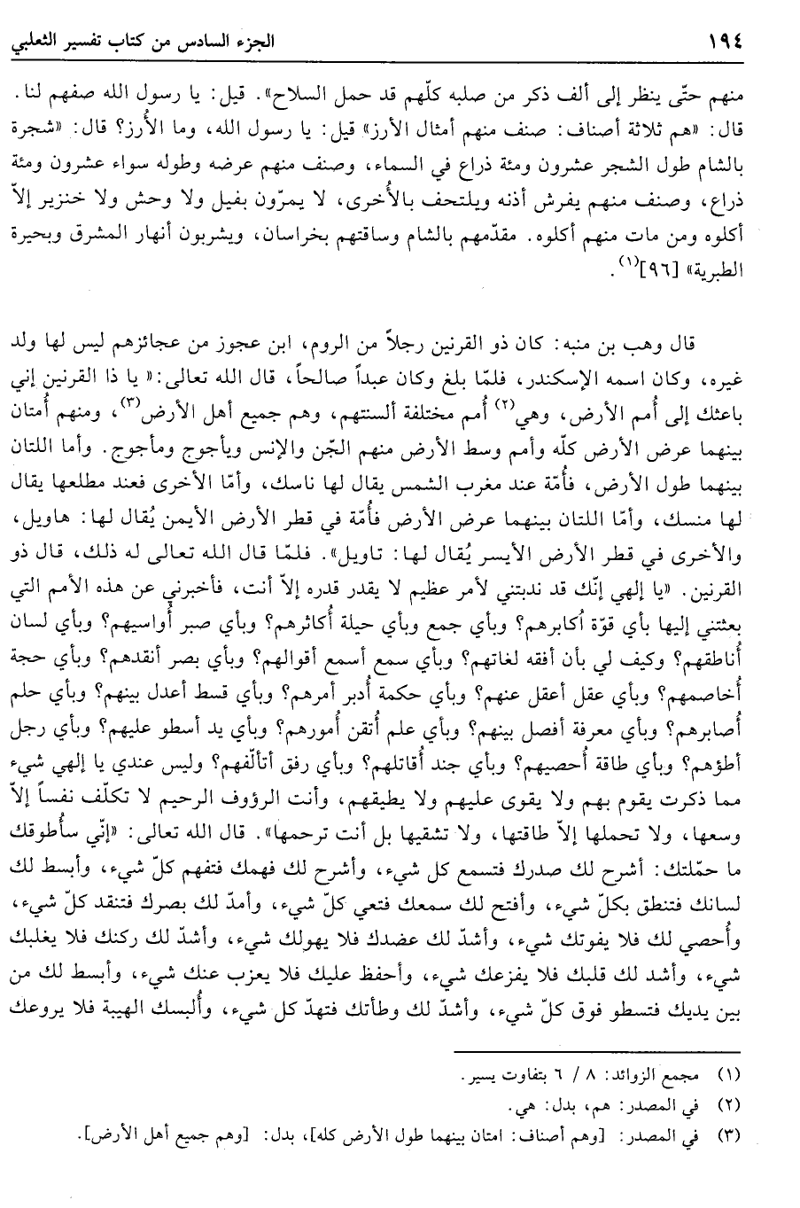قال وهب بن منبه: كان ذو القرنين رجلا من الروم، ابن عجوز من عجائزهم ليس لها ولد غيره، وكان اسمه الإسكندر، فلمّا بلغ وكان عبدا صالحا، قال الله تعالى: «يا ذا القرنين إني باعثك إلى أمم الأرض، وهي «2» أمم مختلفة ألسنتهم، وهم جميع أهل الأرض «3» ، ومنهم أمتان بينهما عرض الأرض كلّه وأمم وسط الأرض منهم الجنّ والإنس ويأجوج ومأجوج. وأما اللتان بينهما طول الأرض، فأمّة عند مغرب الشمس يقال لها ناسك، وأمّا الأخرى فعند مطلعها يقال لها منسك، وأمّا اللتان بينهما عرض الأرض فأمّة في قطر الأرض الأيمن يقال لها: هاويل، والأخرى في قطر الأرض الأيسر يقال لها: تاويل» . فلمّا قال الله تعالى له ذلك، قال ذو القرنين. «يا إلهي إنّك قد ندبتني لأمر عظيم لا يقدر قدره إلّا أنت، فأخبرني عن هذه الأمم التي بعثتني إليها بأي قوّة أكابرهم؟ وبأي جمع وبأي حيلة أكاثرهم؟ وبأي صبر أواسيهم؟ وبأي لسان أناطقهم؟ وكيف لي بأن أفقه لغاتهم؟ وبأي سمع أسمع أقوالهم؟ وبأي بصر أنقدهم؟ وبأي حجة أخاصمهم؟ وبأي عقل أعقل عنهم؟ وبأي حكمة أدبر أمرهم؟ وبأي قسط أعدل بينهم؟ وبأي حلم أصابرهم؟ وبأي معرفة أفصل بينهم؟ وبأي علم أتقن أمورهم؟ وبأي يد أسطو عليهم؟ وبأي رجل أطؤهم؟ وبأي طاقة أحصيهم؟ وبأي جند أقاتلهم؟ وبأي رفق أتألّفهم؟ وليس عندي يا إلهي شيء مما ذكرت يقوم بهم ولا يقوى عليهم ولا يطيقهم، وأنت الرؤوف الرحيم لا تكلّف نَفْساً إِلَّا وُسْعَها، ولا تحملها إلّا طاقتها، ولا تشقيها بل أنت ترحمها» . قال الله تعالى: «إنّي سأطوقك ما حمّلتك: أشرح لك صدرك فتسمع كل شيء، وأشرح لك فهمك فتفهم كلّ شيء، وأبسط لك لسانك فتنطق بكلّ شيء، وأفتح لك سمعك فتعي كلّ شيء، وأمدّ لك بصرك فتنقد كلّ شيء، وأحصي لك فلا يفوتك شيء، وأشدّ لك عضدك فلا يهولك شيء، وأشدّ لك ركنك فلا يغلبك شيء، وأشد لك قلبك فلا يفزعك شيء، وأحفظ عليك فلا يعزب عنك شيء، وأبسط لك من بين يديك فتسطو فوق كلّ شيء، وأشدّ لك وطأتك فتهدّ كلّ شيء، وألبسك الهيبة فلا يروعك