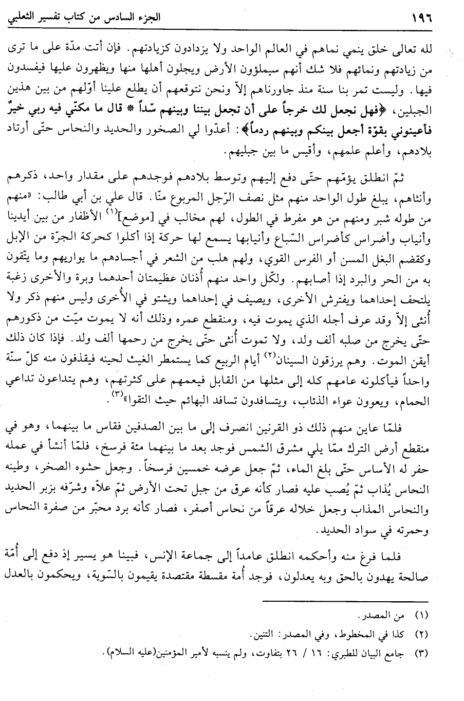 لله تعالى خلق ينمي نماهم في العالم الواحد ولا يزدادون كزيادتهم. فإن أتت مدّة على ما ترى من زيادتهم ونمائهم فلا شك أنهم سيملؤون الأرض ويجلون أهلها منها ويظهرون عليها فيفسدون فيها. وليست تمر بنا سنة منذ جاورناهم إلّا ونحن نتوقعهم أن يطلع علينا أوّلهم من بين هذين الجبلين، فَهَلْ نَجْعَلُ لَكَ خَرْجاً عَلى أَنْ تَجْعَلَ بَيْنَنا وَبَيْنَهُمْ سَدًّا. قالَ ما مَكَّنِّي فِيهِ رَبِّي خَيْرٌ فَأَعِينُونِي بِقُوَّةٍ أَجْعَلْ بَيْنَكُمْ وَبَيْنَهُمْ رَدْماً: أعدّوا لي الصخور والحديد والنحاس حتّى أرتاد بلادهم، وأعلم علمهم، وأقيس ما بين جبليهم.