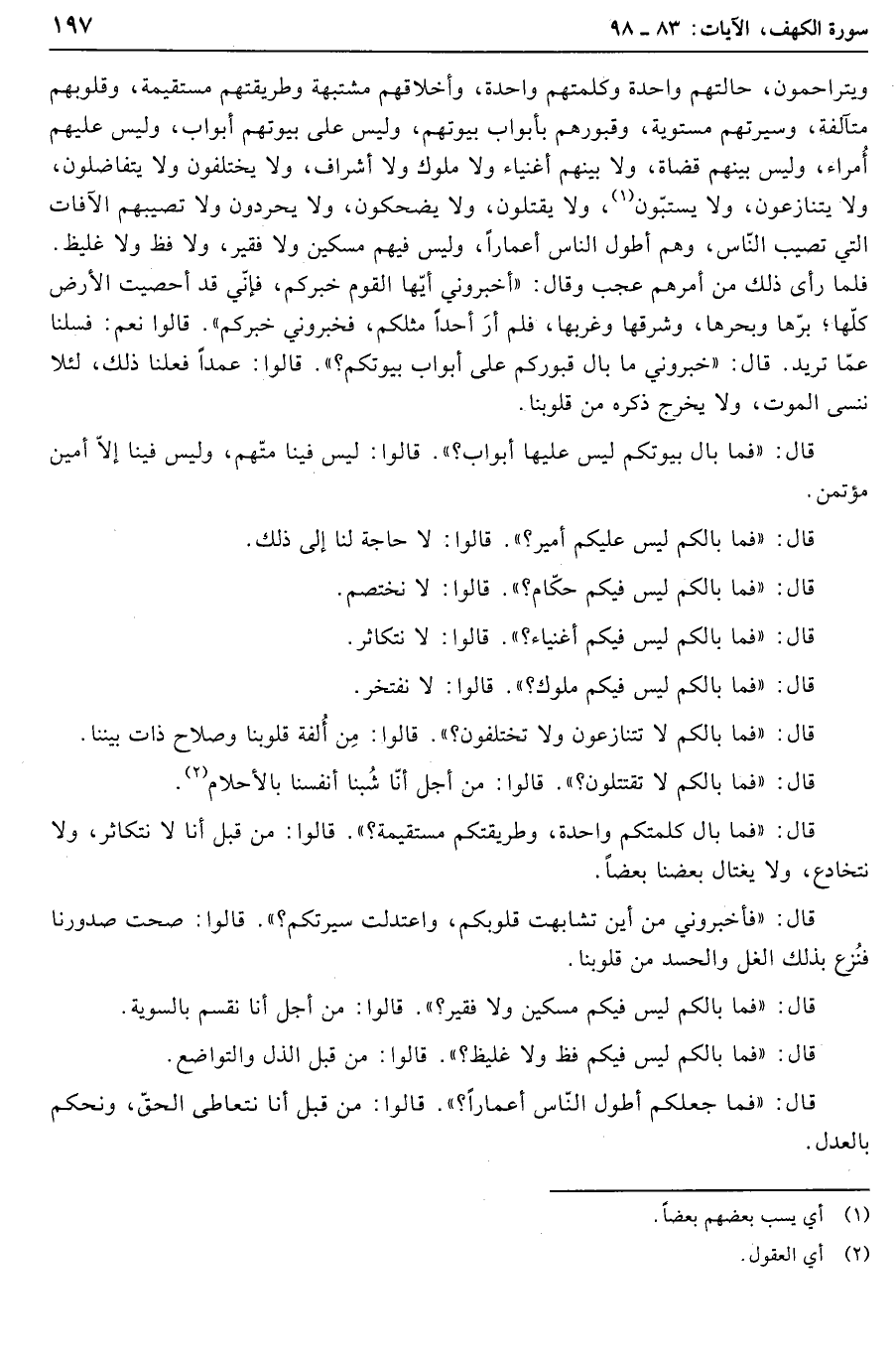قال: «فما بال كلمتكم واحدة، وطريقتكم مستقيمة؟» . قالوا: من قبل أنا لا نتكاثر، ولا نتخادع، ولا يغتال بعضنا بعضا.
