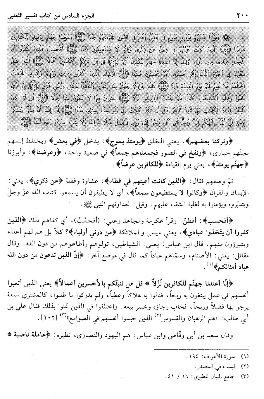 وَتَرَكْنا بَعْضَهُمْ يَوْمَئِذٍ يَمُوجُ فِي بَعْضٍ وَنُفِخَ فِي الصُّورِ فَجَمَعْناهُمْ جَمْعاً (99) وَعَرَضْنا جَهَنَّمَ يَوْمَئِذٍ لِلْكافِرِينَ عَرْضاً (100) الَّذِينَ كانَتْ أَعْيُنُهُمْ فِي غِطاءٍ عَنْ ذِكْرِي وَكانُوا لا يَسْتَطِيعُونَ سَمْعاً (101) أَفَحَسِبَ الَّذِينَ كَفَرُوا أَنْ يَتَّخِذُوا عِبادِي مِنْ دُونِي أَوْلِياءَ إِنَّا أَعْتَدْنا جَهَنَّمَ لِلْكافِرِينَ نُزُلاً (102) قُلْ هَلْ نُنَبِّئُكُمْ بِالْأَخْسَرِينَ أَعْمالاً (103)