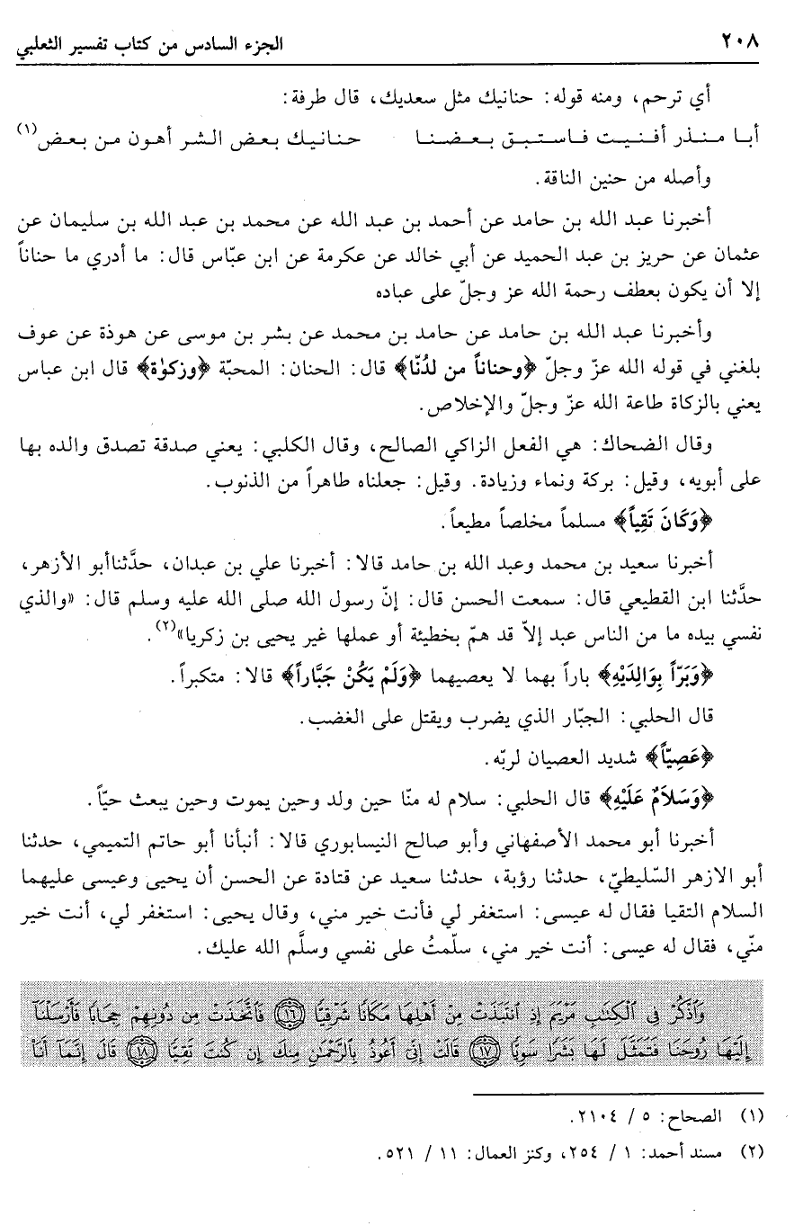 أخبرنا عبد الله بن حامد عن أحمد بن عبد الله عن محمد بن عبد الله بن سليمان عن عثمان عن حريز بن عبد الحميد عن أبي خالد عن عكرمة عن ابن عبّاس قال: ما أدري ما حَناناً إلا أن يكون بعطف رحمة الله عز وجلّ على عباده وأخبرنا عبد الله بن حامد عن حامد بن محمد عن بشر بن موسى عن هوذة عن عوف بلغني في قوله الله عزّ وجلّ وَحَناناً مِنْ لَدُنَّا قال: الحنان: المحبّة وَزَكاةً قال ابن عباس يعني بالزكاة طاعة الله عزّ وجلّ والإخلاص.