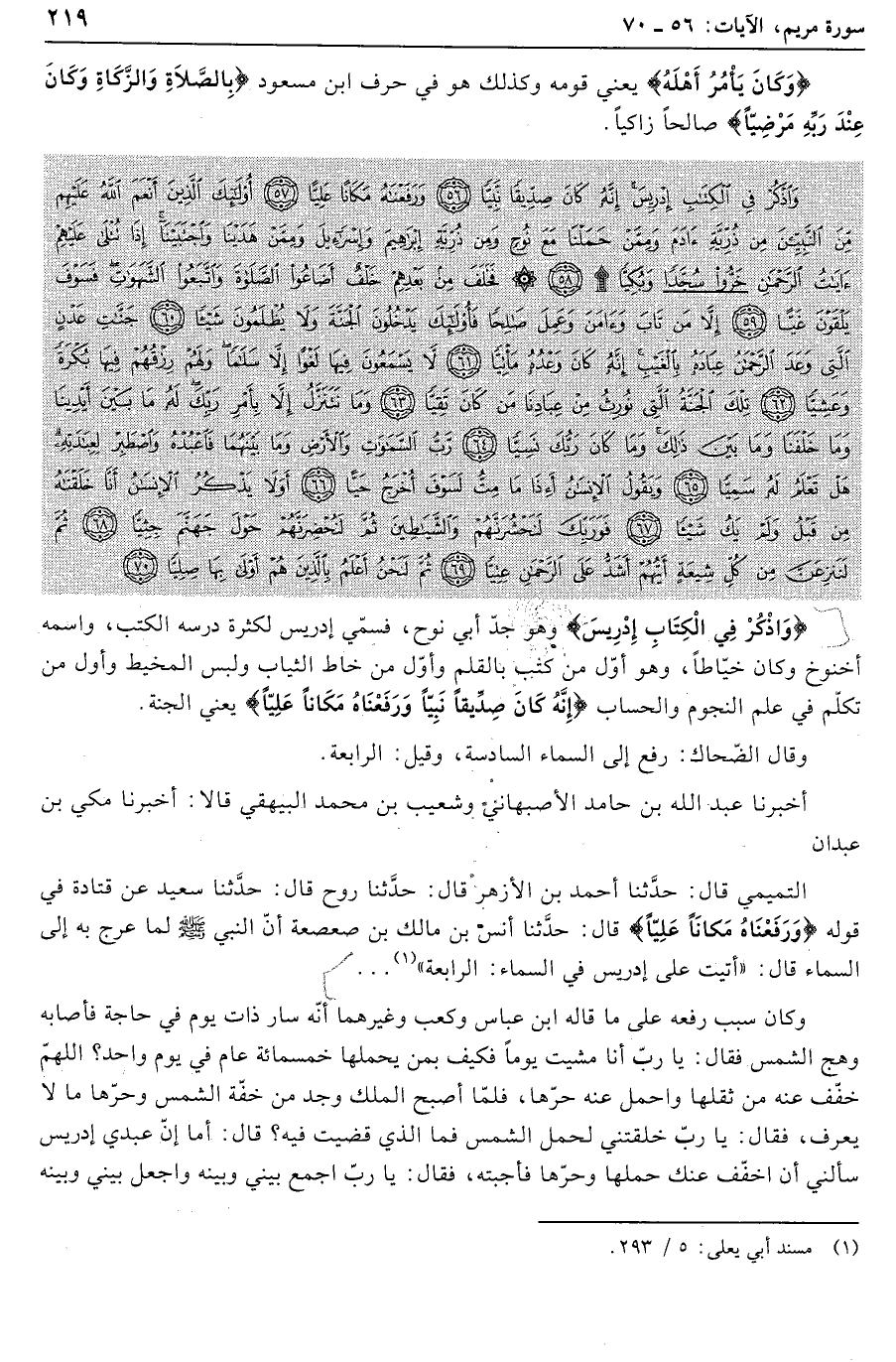 وَاذْكُرْ فِي الْكِتابِ إِدْرِيسَ إِنَّهُ كانَ صِدِّيقاً نَبِيًّا (56) وَرَفَعْناهُ مَكاناً عَلِيًّا (57) أُولئِكَ الَّذِينَ أَنْعَمَ اللَّهُ عَلَيْهِمْ مِنَ النَّبِيِّينَ مِنْ ذُرِّيَّةِ آدَمَ وَمِمَّنْ حَمَلْنا مَعَ نُوحٍ وَمِنْ ذُرِّيَّةِ إِبْراهِيمَ وَإِسْرائِيلَ وَمِمَّنْ هَدَيْنا وَاجْتَبَيْنا إِذا تُتْلى عَلَيْهِمْ آياتُ الرَّحْمنِ خَرُّوا سُجَّداً وَبُكِيًّا (58) فَخَلَفَ مِنْ بَعْدِهِمْ خَلْفٌ أَضاعُوا الصَّلاةَ وَاتَّبَعُوا الشَّهَواتِ فَسَوْفَ يَلْقَوْنَ غَيًّا (59) إِلاَّ مَنْ تابَ وَآمَنَ وَعَمِلَ صالِحاً فَأُولئِكَ يَدْخُلُونَ الْجَنَّةَ وَلا يُظْلَمُونَ شَيْئاً (60)