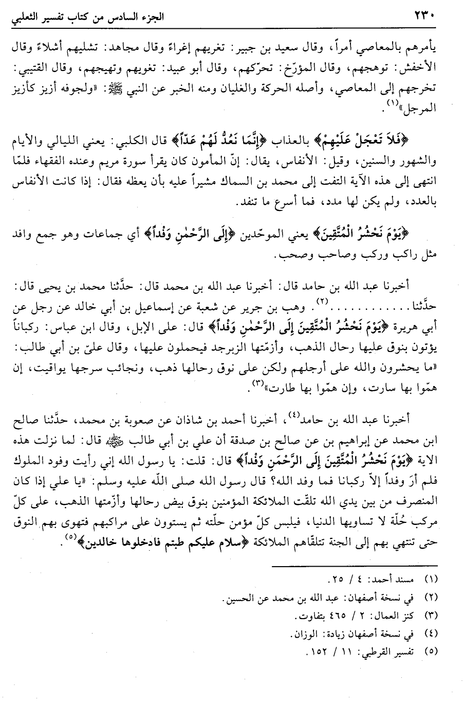 أخبرنا عبد الله بن حامد «4» ، أخبرنا أحمد بن شاذان عن صعوبة بن محمد، حدّثنا صالح ابن محمد عن إبراهيم بن عن صالح بن صدقة أن علي بن أبي طالب رضي الله عنه قال: لما نزلت هذه الآية يَوْمَ نَحْشُرُ الْمُتَّقِينَ إِلَى الرَّحْمنِ وَفْداً قال: قلت: يا رسول الله إني رأيت وفود الملوك فلم أر وفدا إلّا ركبانا فما وفد الله؟ قال رسول الله صلى الله عليه وسلم: «يا علي إذا كان المنصرف من بين يدي الله تلقّت الملائكة المؤمنين بنوق بيض رحالها وأزمّتها الذهب، على كلّ مركب حلّة لا تساويها الدنيا، فيلبس كلّ مؤمن حلّته ثم يستوون على مراكبهم فتهوي بهم النوق حتى تنتهي بهم إلى الجنة تتلقّاهم الملائكة سَلامٌ عَلَيْكُمْ طِبْتُمْ فَادْخُلُوها خالِدِينَ «5» .