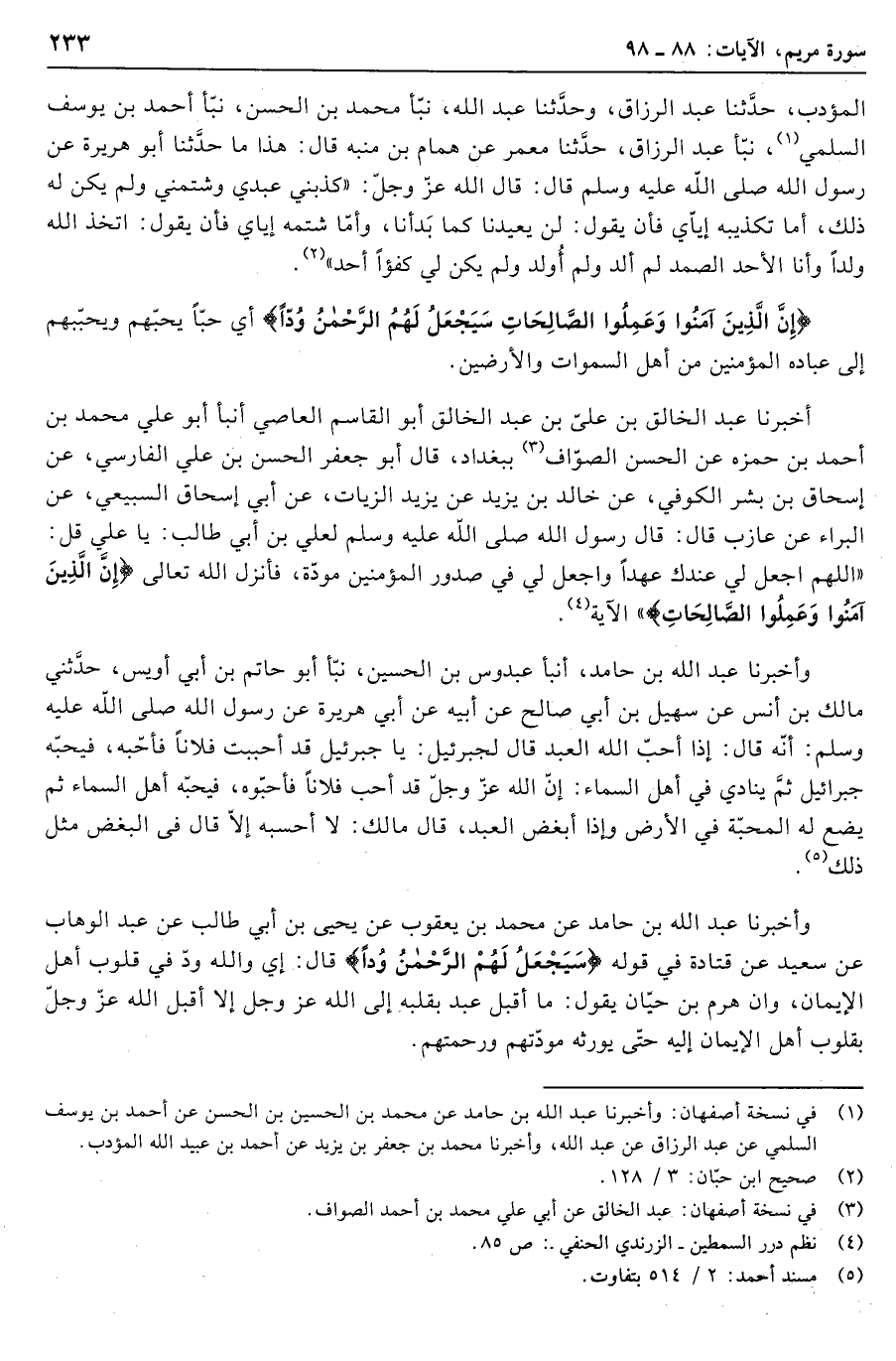 وأخبرنا عبد الله بن حامد عن محمد بن يعقوب عن يحيى بن أبي طالب عن عبد الوهاب عن سعيد عن قتادة في قوله سَيَجْعَلُ لَهُمُ الرَّحْمنُ وُدًّا قال: إي والله ودّ في قلوب أهل الإيمان، وان هرم بن حيّان يقول: ما أقبل عبد بقلبه إلى الله عز وجل إلا أقبل الله عزّ وجلّ بقلوب أهل الإيمان إليه حتّى يورثه مودّتهم ورحمتهم.