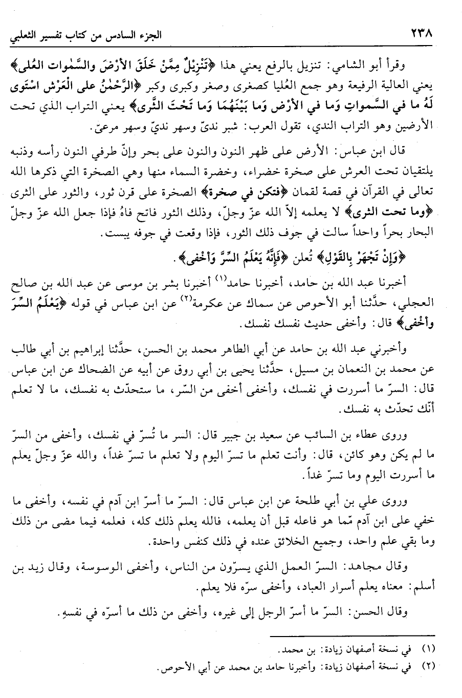 أخبرنا عبد الله بن حامد، أخبرنا حامد «1» أخبرنا بشر بن موسى عن عبد الله بن صالح العجلي، حدّثنا أبو الأحوص عن سماك عن عكرمة «2» عن ابن عباس في قوله يَعْلَمُ السِّرَّ وَأَخْفى قال: وأخفى حديث نفسك نفسك.