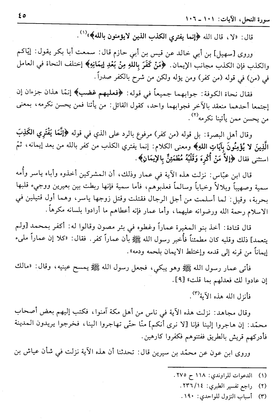 وروى [سهيل] بن أبي خالد عن قيس بن أبي حازم قال: سمعت أبا بكر يقول: إيّاكم والكذب فإن الكذب مجانب الإيمان. مَنْ كَفَرَ بِاللَّهِ مِنْ بَعْدِ إِيمانِهِ اختلف النحاة في العامل في (من) في قوله (مَنْ كَفَرَ) ومن يؤله وَلكِنْ مَنْ شَرَحَ بِالْكُفْرِ صَدْراً.