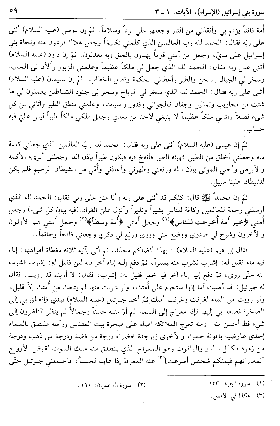 أُمَّةً قانِتاً يؤتم بي وأنقذني من النار وجعلها عليّ بَرْداً وَسَلاماً. ثمّ إن موسى (عليه السلام) أثنى على ربّه فقال: الْحَمْدُ لِلَّهِ رَبِّ الْعالَمِينَ الذي كلمني تكليما وجعل هلاك فرعون منه ونجاة بني إسرائيل على يديّ، وجعل من أمتي قوما يَهْدُونَ بِالْحَقِّ وَبِهِ يَعْدِلُونَ. ثمّ إن داود (عليه السلام) أثنى على ربه فقال: الحمد لله الذي جعل لي ملكا عظيما وعلمني الزبور وألان لي الحديد وسخر لي الجبال يسبحن والطير وأعطاني الْحِكْمَةَ وَفَصْلَ الْخِطابِ. ثمّ إن سليمان (عليه السلام) أثنى على ربه فقال: الحمد لله الذي سخر لي الرياح وسخر لي جنود الشياطين يعملون لي ما شئت مِنْ مَحارِيبَ وَتَماثِيلَ وَجِفانٍ كَالْجَوابِ وَقُدُورٍ راسِياتٍ، وعلمني منطق الطير وآتاني من كل شيء فضلا وآتاني ملكا عظيما لا يَنْبَغِي لِأَحَدٍ مِنْ بَعْدِي وجعل ملكي ملكا طيبا ليس عليّ فيه حساب.