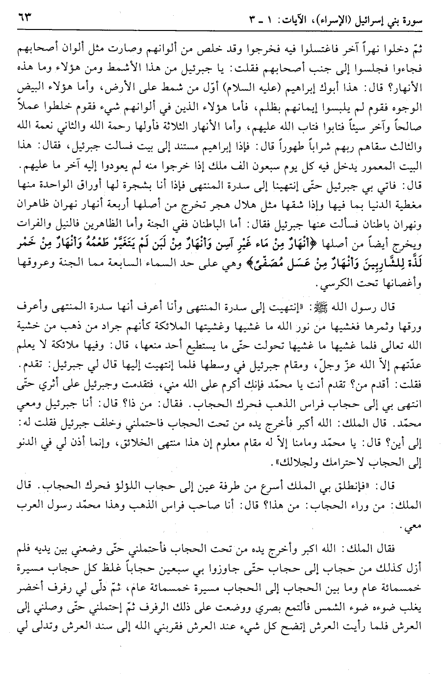 قال: «فانطلق بي الملك أسرع من طرفة عين إلى حجاب اللؤلؤ فحرك الحجاب. قال الملك: من وراء الحجاب: من هذا؟ قال: أنا صاحب فراس الذهب وهذا محمّد رسول العرب معي.