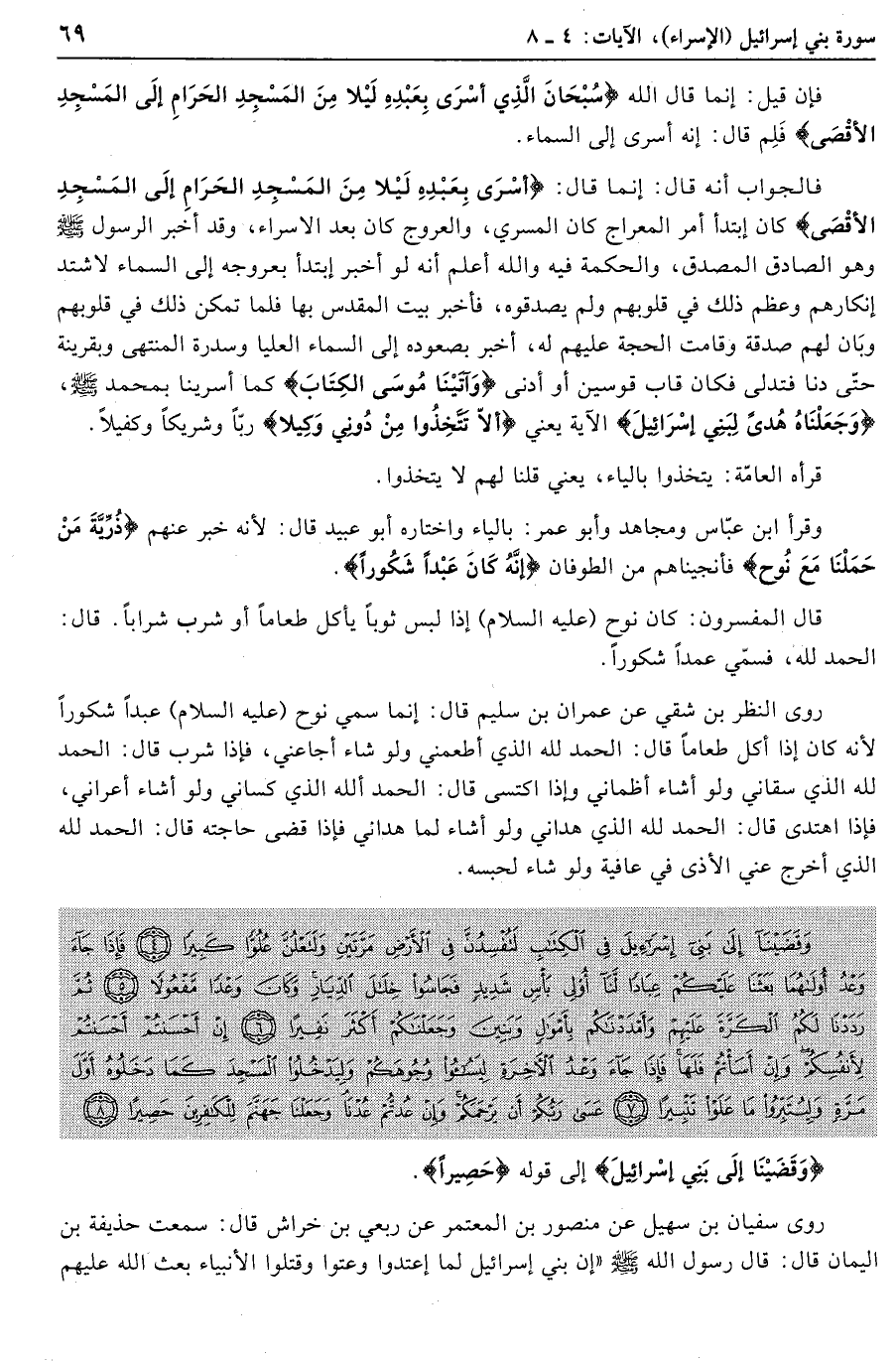 وَقَضَيْنا إِلى بَنِي إِسْرائِيلَ فِي الْكِتابِ لَتُفْسِدُنَّ فِي الْأَرْضِ مَرَّتَيْنِ وَلَتَعْلُنَّ عُلُوًّا كَبِيراً (4) فَإِذا جاءَ وَعْدُ أُولاهُما بَعَثْنا عَلَيْكُمْ عِباداً لَنا أُولِي بَأْسٍ شَدِيدٍ فَجاسُوا خِلالَ الدِّيارِ وَكانَ وَعْداً مَفْعُولاً (5) ثُمَّ رَدَدْنا لَكُمُ الْكَرَّةَ عَلَيْهِمْ وَأَمْدَدْناكُمْ بِأَمْوالٍ وَبَنِينَ وَجَعَلْناكُمْ أَكْثَرَ نَفِيراً (6) إِنْ أَحْسَنْتُمْ أَحْسَنْتُمْ لِأَنْفُسِكُمْ وَإِنْ أَسَأْتُمْ فَلَها فَإِذا جاءَ وَعْدُ الْآخِرَةِ لِيَسُوؤُا وُجُوهَكُمْ وَلِيَدْخُلُوا الْمَسْجِدَ كَما دَخَلُوهُ أَوَّلَ مَرَّةٍ وَلِيُتَبِّرُوا ما عَلَوْا تَتْبِيراً (7) عَسى رَبُّكُمْ أَنْ يَرْحَمَكُمْ وَإِنْ عُدْتُمْ عُدْنا وَجَعَلْنا جَهَنَّمَ لِلْكافِرِينَ حَصِيراً (8)