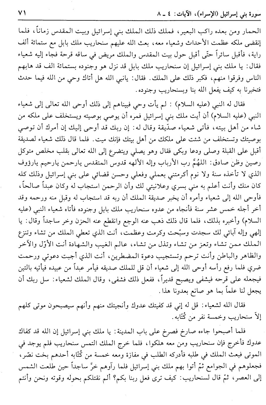 فقال له النبي (عليه السلام) : لم يأت وحي فبيناهم إلى ذلك أوحى الله تعالى إلى شعياء النبي (عليه السلام) أن ائت ملك بني إسرائيل فمره أن يوصي بوصيته ويستخلف على ملكه من شاء من أهل بيته، فأتى شعياء صدّيقة وقال له: إن ربك قد أوحى إليك إن أمرك أن توصي بوصيتك وتستخلف من شئت على ملكك من أهل بيتك فإنك ميت. فلما قال ذلك شعياء لصديقة أقبل على القبلة وصلى ودعا وبكى فقال وهو يصلي ويتضرع إلى الله تعالى بقلب مخلص متوكل رصين وظن صادق: اللهمّ رب الأرباب وإله الآلهة قدوس المتقدس يا رحمن يا رحيم يا رؤوف الذي لا تَأْخُذُهُ سِنَةٌ وَلا نَوْمٌ أكرمتني بعملي وفعلي وحسن قضائي على بني إسرائيل وذلك كله كان منك وأنت أعلم به مني بسري وعلانيتي لك وأن الرحمن استجاب له وكان عبدا صالحا، فأوحى الله إلى شعياء وأمره أن يخبر صديقة الملك أن ربه قد استجاب له وقبل منه ورحمه وقد أخر أجله خمس عشر سنة فأنجاه من عدوه سنحاريب ملك بابل وجنوده فأتاه شعياء النبي (عليه السلام) وأخبره بذلك، فلما قال ذلك ذهب عنه الوجع وانقطع عنه الحزن وخر ساجدا وقال: يا إلهي وإله آبائي لك سجدت وسبّحت وكرمت وعظمت، أنت الذي تعطي الْمُلْكَ مَنْ تَشاءُ وَتَنْزِعُ الْمُلْكَ مِمَّنْ تَشاءُ وَتُعِزُّ مَنْ تَشاءُ وَتُذِلُّ مَنْ تَشاءُ، عالِمُ الْغَيْبِ وَالشَّهادَةِ أنت الْأَوَّلُ وَالْآخِرُ وَالظَّاهِرُ وَالْباطِنُ وأنت ترحم وتستجيب دعوة المضطرين، أنت الذي أجبت دعوتي ورحمت ضري فلما رفع رأسه أوحى الله إلى شعياء أن قل للملك صديقه فيأمر عبدا من عبيده فيأتيه بالتين فيجعله على قرحه فيشفى ويصبح قديرا، ففعل ذلك فشفى، وقال الملك لشعياء: سل ربك أن يجعل لنا علما بما هو صانع بعدونا هذا.