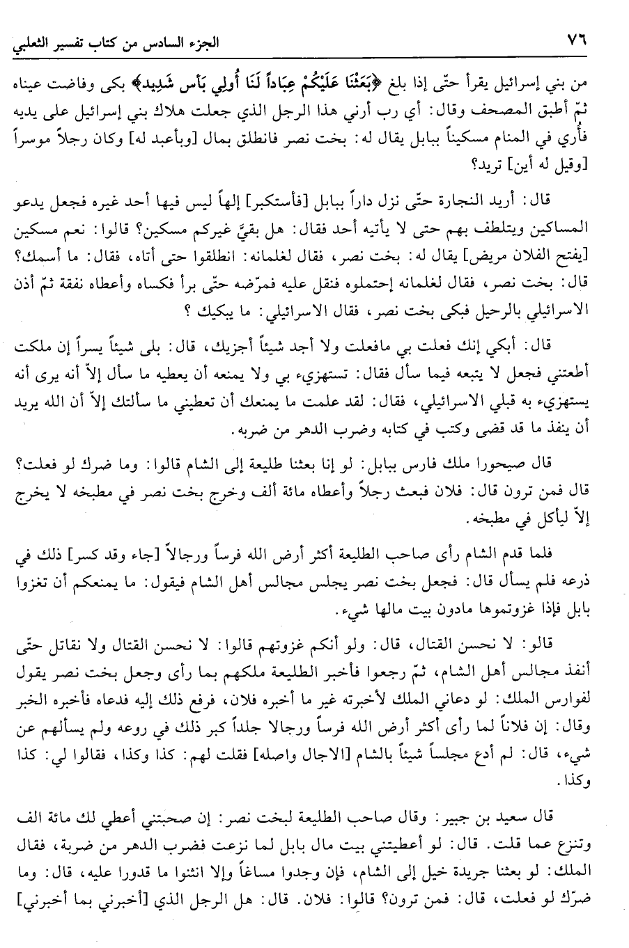 من بني إسرائيل يقرأ حتّى إذا بلغ بَعَثْنا عَلَيْكُمْ عِباداً لَنا أُولِي بَأْسٍ شَدِيدٍ بكى وفاضت عيناه ثمّ أطبق المصحف وقال: أي رب أرني هذا الرجل الذي جعلت هلاك بني إسرائيل على يديه فأري في المنام مسكينا ببابل يقال له: بخت نصر فانطلق بمال [وبأعبد له] وكان رجلا موسرا [وقيل له أين] تريد؟
