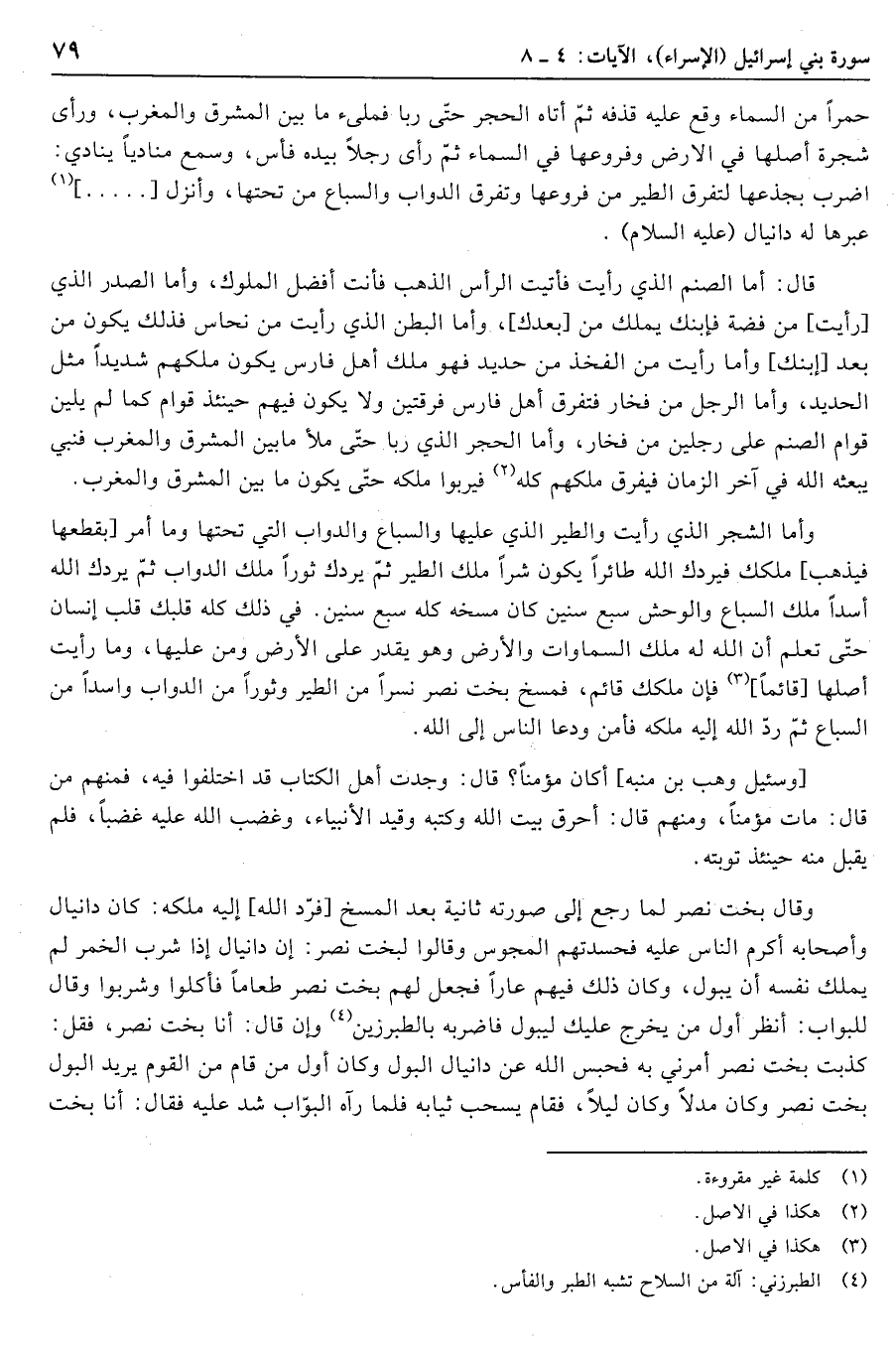 وأما الشجر الذي رأيت والطير الذي عليها والسباع والدواب التي تحتها وما أمر [بقطعها فيذهب] ملكك فيردك الله طائرا يكون شرا ملك الطير ثمّ يردك ثورا ملك الدواب ثمّ يردك الله أسدا ملك السباع والوحش سبع سنين كان مسخه كله سبع سنين. في ذلك كله قلبك قلب إنسان حتّى تعلم أَنَّ اللَّهَ لَهُ مُلْكُ السَّماواتِ وَالْأَرْضِ وهو يقدر على الأرض ومن عليها، وما رأيت أصلها [قائما] «3» فإن ملكك قائم، فمسخ بخت نصر نسرا من الطير وثورا من الدواب وأسدا من السباع ثمّ ردّ الله إليه ملكه فأمن ودعا الناس إلى الله.