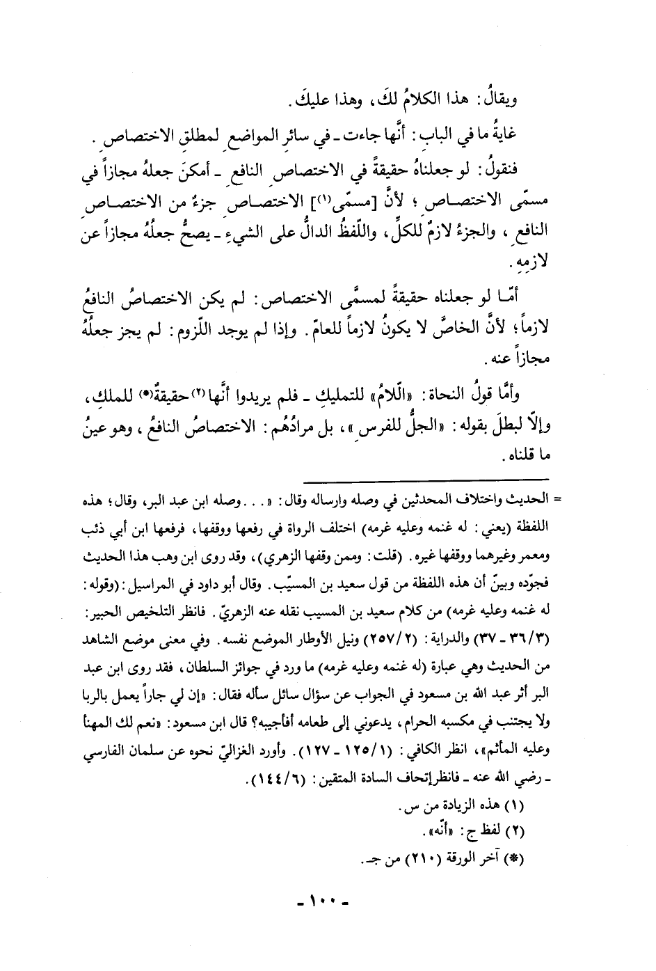 ويقال هذا الكلام لك وهذا عليك غاية ما في الباب أنها جاءت في سائر المواضع لمطلق الاختصاص فنقول لو جعلناه حقيقة في الاختصاص النافع أمكن جعله مجازا في مسمى الاختصاص لأن مسمى الاختصاص جزء من الاختصاص النافع والجزء لازم للكل واللفظ الدال على الشئ يصح جعله مجازا عن لازمه أما لو جعلناه حقيقة لمسمى الاختصاص لم يكن الاختصاص النافع لازما لأن الخاص لا يكون لازما للعام وإذا لم يوجد اللزوم لم يجز جعله مجازا عنه وأما قول النحاة اللام للتمليك فلم يريدوا أنها حقيقة للملك وإلا لبطل بقوله الجل للفرس بل مرادهم الاختصاص النافع وهو عين ما قلناه