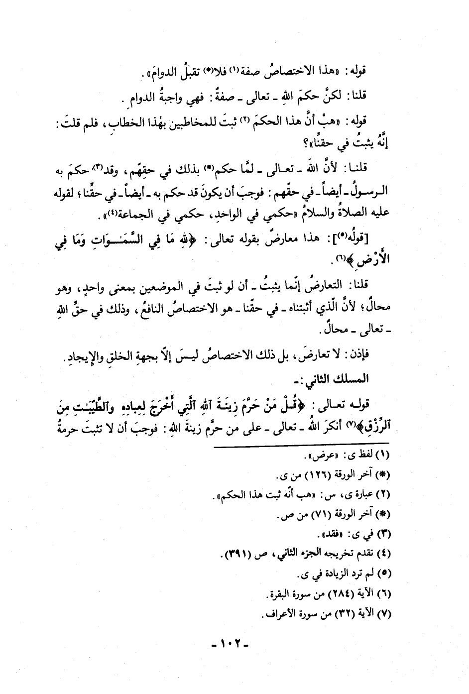 قلنا لأن الله تعالى لما حكم بذلك في حقهم وقد حكم به الرسول أيضا في حقهم فوجب أن يكون قد حكم به أيضا في حقنا لقوله عليه الصلاة والسلام حكمي في الواحد حكمي في الجماعة قوله هذا معارض بقوله تعالى لله ما في السماوات وما في الأرض قلنا التعارض إنما يثبت أن لو ثبت في الموضعين بمعنى واحد وهو محال لأن الذي أثبتناه في حقنا هو الاختصاص النافع وذلك في حق الله تعالى محال فإذن لا تعارض بل ذلك الاختصاص ليست إلا بجهة الخلق والإيجاد المسلك الثاني قوله تعالى قل من حرم زينة الله التي أخرج لعباده والطيبات من الرزق أنكر الله تعالى على من حرم زينة الله فوجب أن لا تثبت حرمة