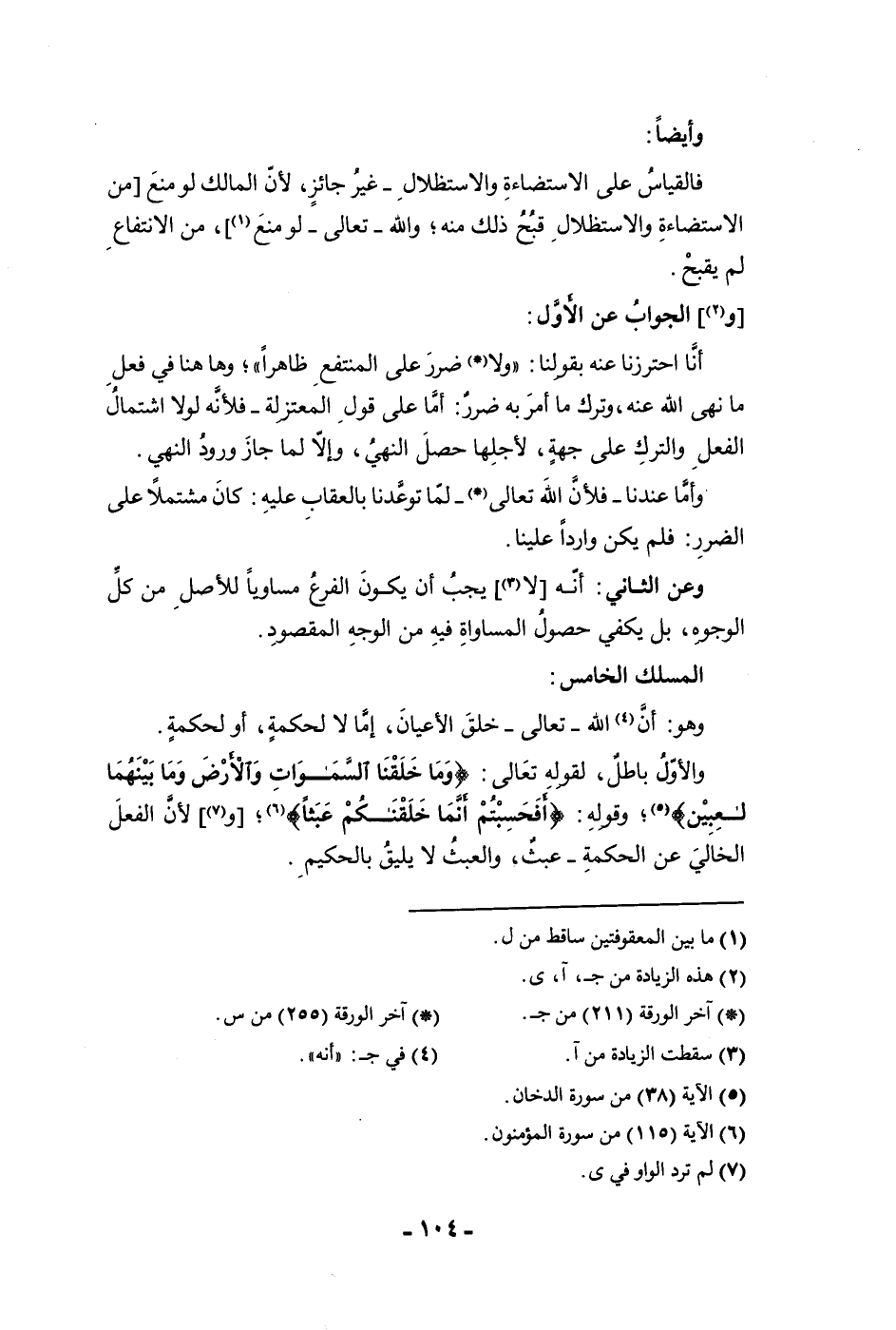 وعن الثاني أنه لا يجب أن يكون الفرع مساويا للأصل من كل الوجوه بل يكفي حصول المساواة فيه من الوجه المقصود المسلك الخامس وهو أن الله تعالى خلق الأعيان إما لا لحكمة أو لحكمة والأول باطل لقوله تعالى وما خلقنا السماوات والأرض وما بينهما لاعبين وقوله أفحسبتم أنما خلقناكم عبثا ولأن الفعل الخالي عن الحكمة عبث والعبث لا يليق بالحكيم
