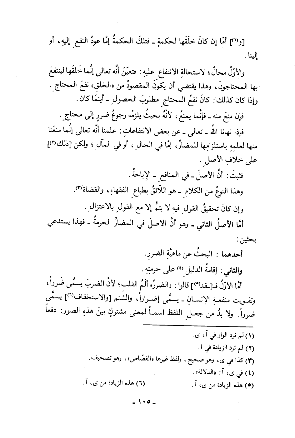وأما إن كان خلقها لحكمة فتلك الحكمة إما عود النفع إليه أو إلينا والأول محال لاستحالة الانتفاع عليه فتعين أنه تعالى إنما خلقها لينتفع بها المحتاجون وهذا يقتضي أن يكون المقصود من الخلق نفع المحتاج وإذا كان كذلك كان نفع المحتاج مطلوب الحصول أينما كان فإن منع منه فإنما يمنع لأنه بحيث يلزمه رجوع ضرر إلى محتاج فإذا نهانا الله تعالى عن بعض الانتفاعات علمنا أنه تعالى إنما منعنا منها لعلمه باستلزامها للمضار إما في الحال أو في المآل ولكن ذلك على خلاف الأصل فثبت أن الأصل في المنافع الإباحة وهذا النوع من الكلام هو اللائق بطباع الفقهاء والقضاة وإن كان تحقيق القول فيه لا يتم إلا مع القول بالاعتزال أما الأصل الثاني وهو أن الأصل في المضار الحرمة فهذا يستدعي بحثين