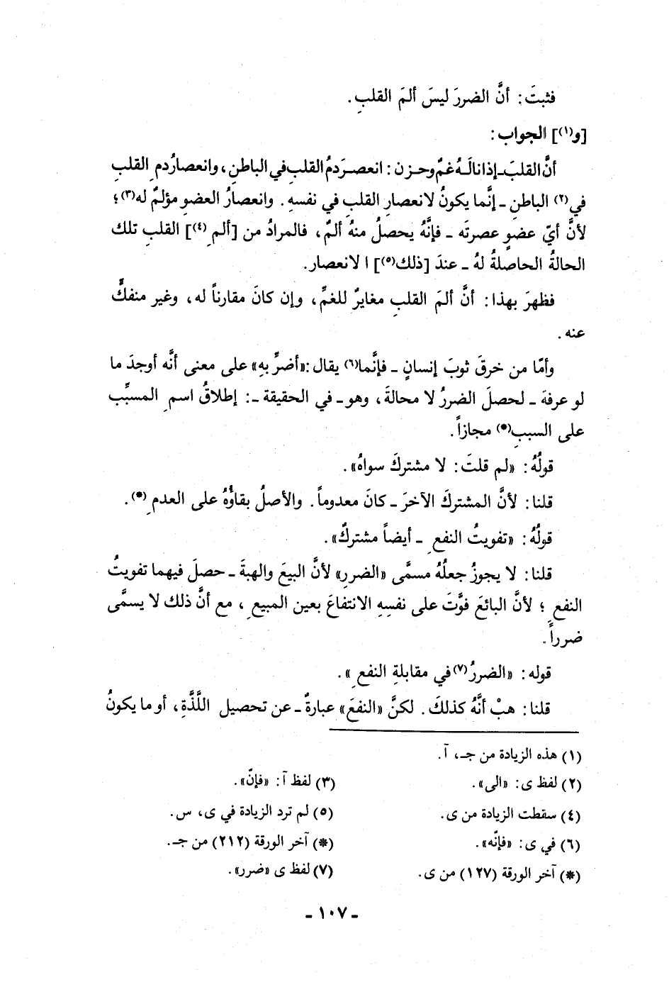 فثبت أن الضرر ليس ألم القلب والجواب أن القلب إذا ناله غم وحزن انعصر دم القلب في الباطن وانعصار دم القلب في الباطن إنما يكون لانعصار يكون القلب في نفسه وانعصار العضو مؤلم له لأن أي عضو عصرته فإنه يحصل منه ألم فالمراد من ألم القلب تلك الحالة الحاصلة له عند ذلك الانعصار مع فظهر بهذا أن ألم القلب مغاير للغم وإن كان مقارنا له وغير منفك عنه وأما من خرق ثوب إنسان فإنما يقال أضربه على معنى أنه أوجد ما لو عرفه لحصل الضرر لا محالة وهو في الحقيقة اطلاق اسم المسبب على السبب مجازا قوله لم قلت لا مشترك سواه قلنا لأن المشترك الآخر كان معدوما والأصل بقاؤه على العدم قوله تفويت النفع أيضا مشترك قلنا لا يجوز جعله مسمى الضرر لأن البيع والهبة حصل فيهما تفويت النفع لأن البائع فوت على نفسه الانتفاع بعين المبيع مع أن ذلك لا يسمى