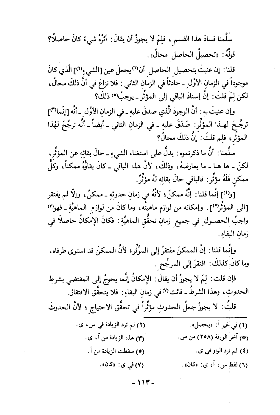 سلمنا فساد هذا القسم فلم لا يجوز أن يقال أثره شئ كان حاصلا قوله تحصيل الحاصل محال قلنا إن عنيت بتحصيل الحاصل أن يجعل عين الشئ الذي كان موجودا في الزمان الأول حادثا في الزمان الثاني فلا نزاع في أن ذلك محال لكن لم قلت إن إسناد الباقي إلى المؤثر يوجب ذلك وإن عنيت به أن الوجود الذي صدق عليه في الزمان الأول أنه أنما ترجح لهذا المؤثر صدق عليه في الزمان الثاني أيضا أنه ترجح لهذا المؤثر فلم قلت إن ذلك محال سلمنا أن ما ذكرتموه يدل على استغناء الشئ حال بقائه عن المؤثر لكن ها هنا ما يعارضه وذلك لأن هذا الباقي كان بقاؤه ممكنا وكل ممكن فله مؤثر فالباقي حال بقائه له مؤثر وإنما قلنا أنه ممكن لأنه في زمان حدوثه ممكن وإلا لم يفتقر إلى المؤثر وإمكانه من لوازم ماهيته وما كان من لوازم الماهية فهو واجب الحصول في جميع زمان تحقق الماهية فكان الإمكان حاصلا في زمان البقاء وإنما قلنا إن الممكن مفتقر إلى المؤثر لأن الممكن قد استوى طرفاه وما كان كذلك افتقر إلى المرجح فإن قلت لم لا يجوز أن يقال الإمكان إنما يحوج إلى المقتضى بشرط الحدوث وهذا الشرط فائت في زمان البقاء فلا يتحقق الافتقار قلت لا يجوز جعل الحدوث مؤثرا في تحقق الاحتياج لأن الحدوث