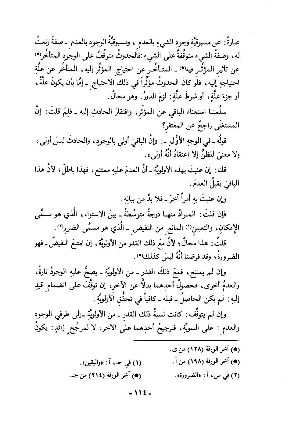 له وصفة الشئ متوقفة على الشئ فالحدوث متوقف على الوجود المتأخر عن تأثير المؤثر فيه المتأخر عن احتياج المؤثر إليه المتأخر عن علة احتياجه إليه فلو كان الحدوث مؤثرا في ذلك الاحتياج إما بأن يكون علة أو جزء علة أو شرط علة لزم الدور وهو محال سلمنا استغناء الباقي عن المؤثر وافتقار الحادث إليه فلم قلت إن المستغني راجح عن المفتقر قوله في الوجه الأول أن الباقي أولى بالوجود والحادث ليس أولى ولا معنى للظن إلا اعتقاد أنه أولى قلنا إن عنيت بهذه الأولوية أن العدم عليه ممتنع فهذا باطل لأن هذا الباقي يقبل العدم وإن عنيت به أمرا آخر فلا بد من بيانه فإن قلت المراد منها درجة متوسطة بين الاستواء الذي هو مسمى الإمكان والتعيين المانع من النقيض الذي هو مسمى الضرر قلت هذا محال لأن مع ذلك القدر من الأولوية إن امتنع النقيض فهو الضرروة وقد فرضنا أنه ليس كذلك وإن لم يمتنع فمع ذلك القدر من الأولوية يصح عليه الوجود تارة والعدم أخرى فحصول أحدهما بدلا عن الآخر إن توقف على انضمام قيد إليه لم يكن الحاصل قبله كافيا في تحقق الأولوية وإن لم يتوقف كانت نسبة ذلك القدر من الأولوية إلى طرفي الوجود والعدم على السوية فترجيح أحدهما على الآخر لا لمرجح زائد يكون