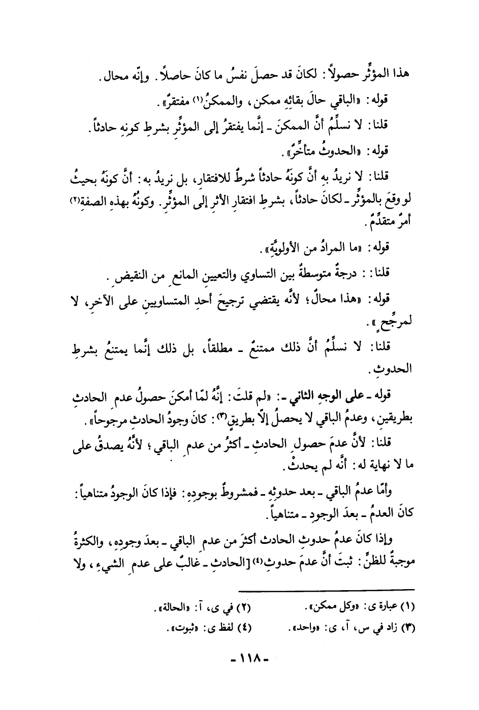 قوله الحدوث متأخر قلنا لا نريد به أن كونه حادثا شرط للافتقار بل نريد به أن كونه بحيث لو وقع بالمؤثر لكان حادثا بشرط افتقار الأثر إلى المؤثر وكونه بهذه الصفة أمر متقدم قوله ما المراد من الأولوية قلنا درجة متوسطة بين التساوي والتعيين المانع من النقيض قوله هذا محال لأنه يقتضي ترجيح أحد المتساويين على الآخر لا لمرجح قلنا لا نسلم أن ذلك ممتنع مطلقا بل ذلك إنما يمتنع بشرط الحدوث قوله على الوجه الثاني لم قلت إنه لما أمكن حصول عدم الحادث بطريقين وعدم الباقي لا يحصل إلا بطريق كان وجود الحادث مرجوحا قلنا لأن عدم حصول الحادث أكثر من عدم الباقي لأنه يصدق على ما لا نهاية له أنه لم يحدث وأما عدم الباقي بعد حدوثه فمشروط بوجوده فإذا كان الوجود متناهيا كان العدم بعد الوجود متناهيا وإذا كان عدم حدوث الحادث أكثر من عدم الباقي بعد وجوده والكثرة موجبة للظن ثبت أن عدم حدوث الحادث غالب على عدم الشئ ولا