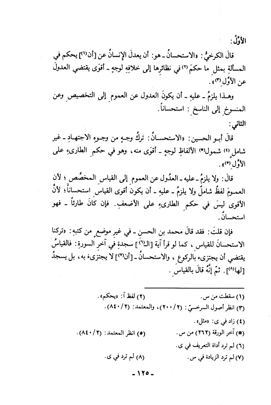 الأول قال الكرخي الاستحسان هو أن يعدل الإنسان عن أن يحكم في المسألة بمثل ما حكم في نظائرها إلى خلافه لوجه أقوى يقتضي العدول عن الأول وهذا يلزم عليه أن يكون العدول عن العموم إلى التخصيص وعن المنسوخ إلى الناسخ استحسانا الثاني قال أبو الحسين الاستحسان ترك وجه من وجوه الاجتهاد غير شامل شمول الألفاظ لوجه أقوى منه وهو في حكم الطارئ على الأول قال ولا يلزم عليه العدول عن العموم إلى القياس المخصص لأن العموم لفظ شامل ولا يلزم عليه أن يكون أقوى القياس استحسانا لأن الأقوى ليس في حكم الطارئ على الأضعف فإن كان طارئا فهو استحسان فإن قلت فقد قال محمد بن الحسن في غير موضع من كتبه تركنا الاستحسان للقياس كما لو قرأ آية ال سجدة في آخر السورة فالقياس يقتضي أن يجتزئ بالركوع والاستحسان أن لا يجتزئ به بل يسجد لها ثم إنه قال بالقياس