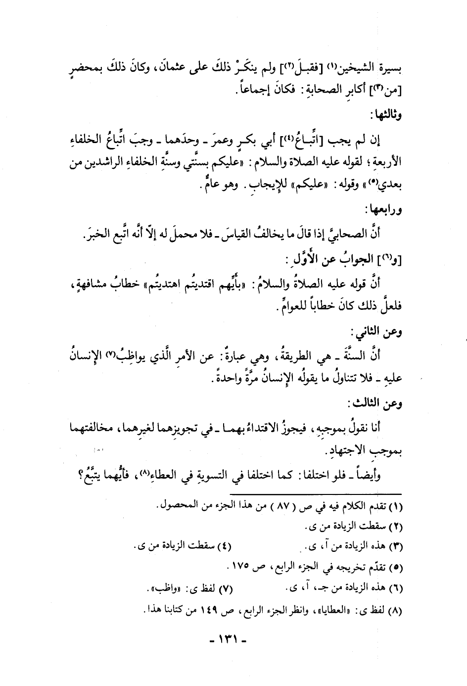 الأربعة لقوله عليه الصلاة والسلام عليكم بسنتي وسنة الخلفاء الراشدين من بعدي وقوله عليكم للإيجاب وهو عام ورابعها أن الصحابي إذا قال ما يخالف القياس فلا محمل له إلا أنه اتبع الخبر والجواب عن الأول أن قوله عليه الصلاة والسلام بأيهم اقتديتم اهتديتم خطاب مشافهة فلعل ذلك كان خطابا للعوام وعن الثاني أن السنة هي الطريقة وهي عبارة عن الأمر الذي يواظب الإنسان عليه فلا تتناول ما يقوله الإنسان مرة واحدة وعن الثالث أنا نقول بموجبه فيجوز الاقتداء بهما في تجويزهما لغيرهما مخالفتهما بموجب الاجتهاد وأيضا فلو اختلفا كما اختلفا في التسوية في العطاء فأيهما يتبع