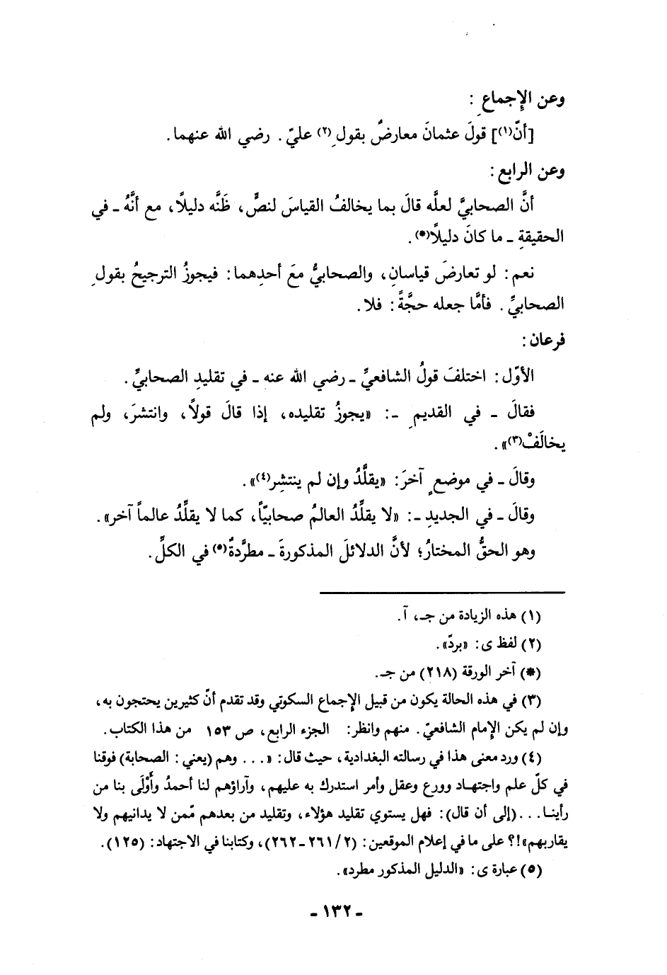 فرعان الأول اختلف قول الشافعي رضي الله عنه في تقليد الصحابي فقال في القديم يجوز تقليده إذا قال قولا وانتشر ولم يخالف وقال في موضع آخر يقلد وإن لم ينتشر وقال في الجديد لا يقلد العالم صحابيا كما لا يقلد عالما آخر وهو الحق المختار لأن الدلائل المذكورة مطردة في الكل
