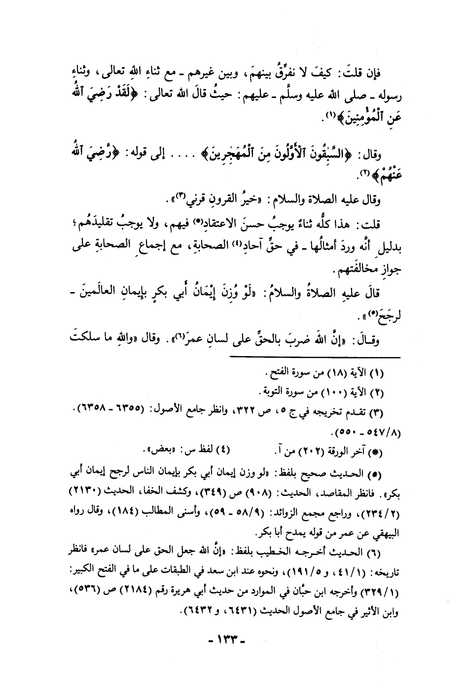 فإن قلت كيف لا نفرق بينهم وبين غيرهم مع ثناء الله تعالى وثناء رسوله ص عليهم حيث قال الله تعالى لقد رضي الله عن المؤمنين وقال السابقون الأولون من المهاجرين إلى قوله رضي الله عنهم وقال عليه الصلاة والسلام خير القرون قرني قلت هذا كله ثناء يوجب حسن الاعتقاد فيهم ولا يوجب تقليدهم بدليل أنه ورد أمثالها في حق آحاد الصحابة مع إجماع الصحابة على جواز مخالفتهم قال عليه الصلاة والسلام لو وزن إيمان أبي بكر بإيمان العالمين لرجح وقال إن الله ضرب بالحق على لسان عمر وقال والله ما سلكت