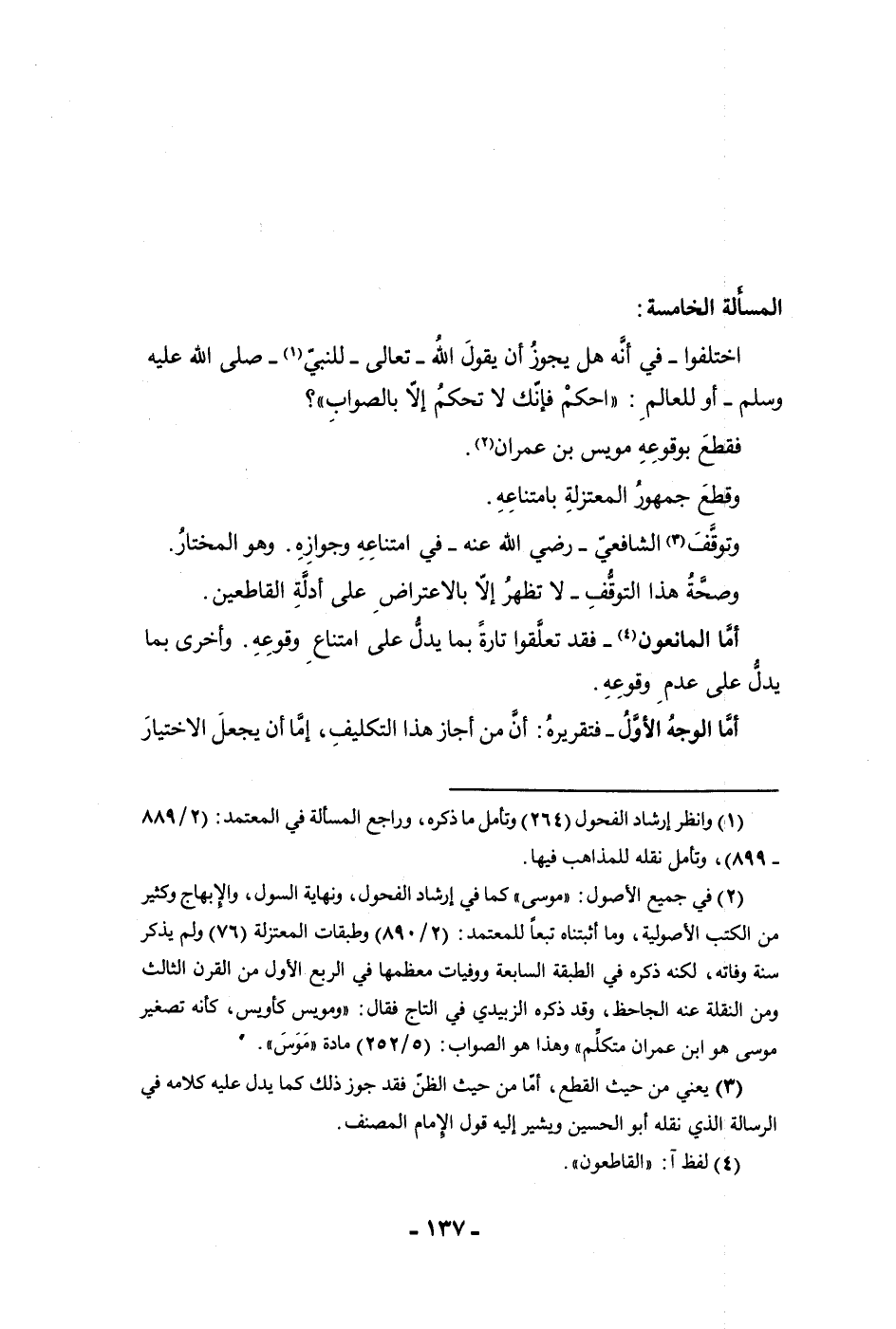 أو للعالم احكم فإنك لا تحكم إلا بالصواب فقطع بوقوعه مويس بن عمران وقطع جمهور المعتزلة بامتناعه وتوقف الشافعي رضي الله عنه في امتناعه وجوازه وهو المختار وصحة هذا التوقف لا تظهر إلا بالاعتراض على أدلة القاطعين أما المانعون ففقد تعلقوا تارة بما يدل على امتناع وقوعه وأخرى بما يدل على عدم وقوعه أما الوجه الأول فتقريره أن من أجاز هذا التكليف إما أن يجعل الاختيار